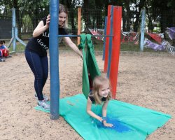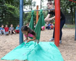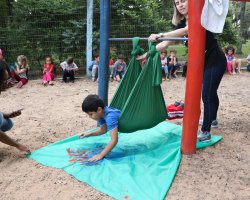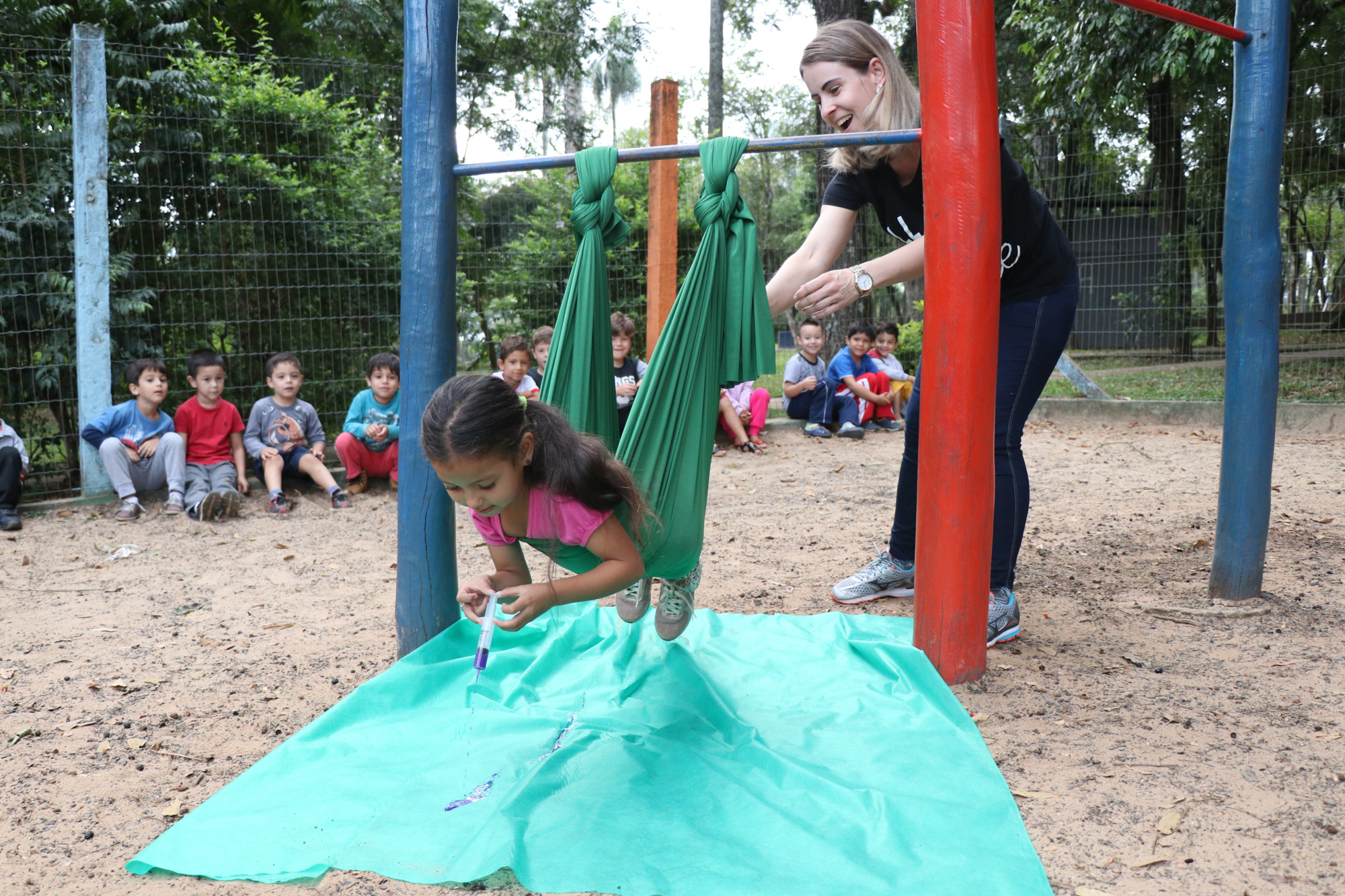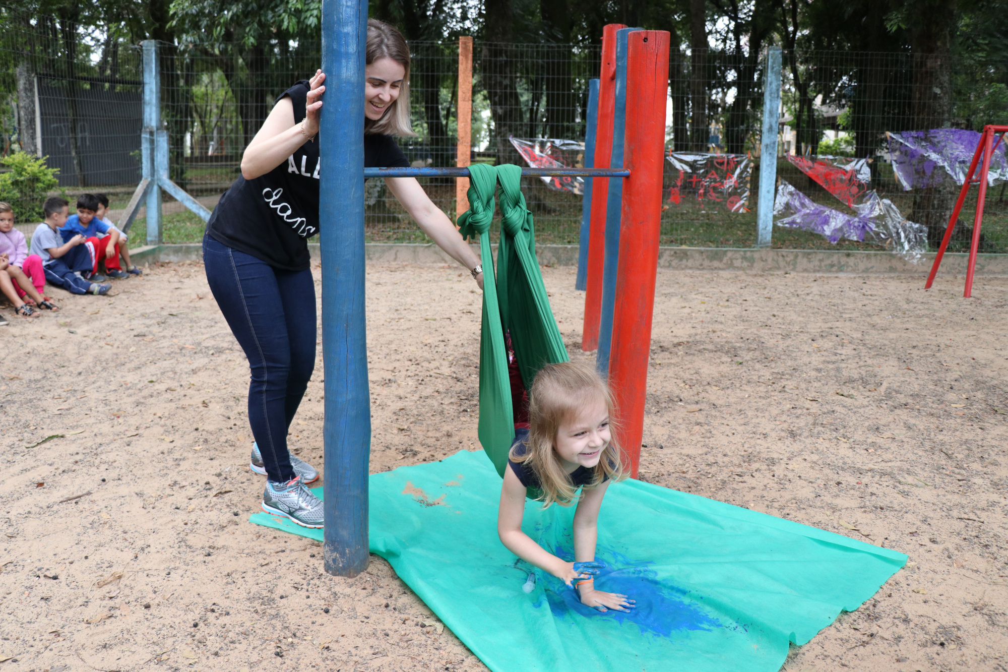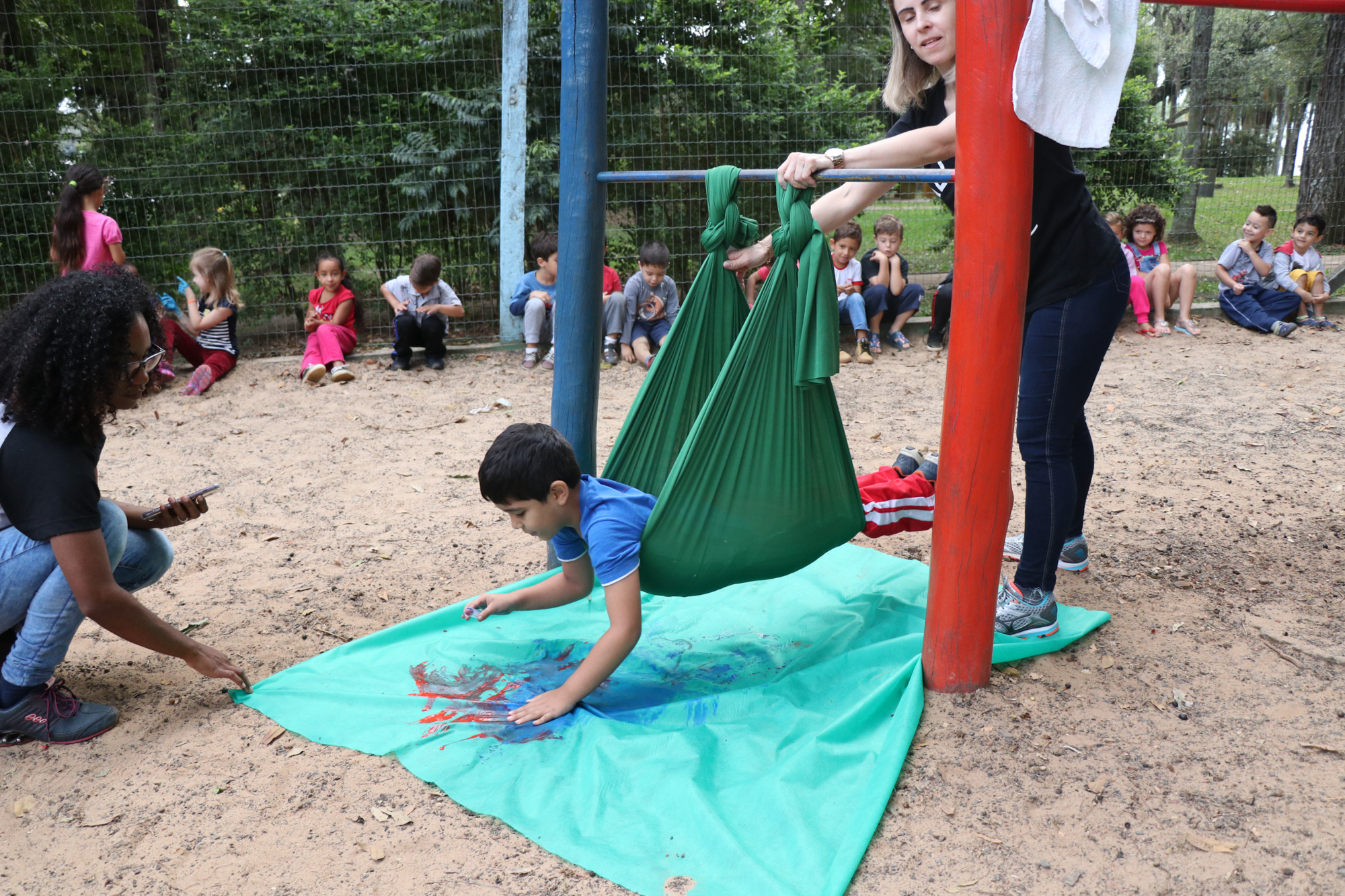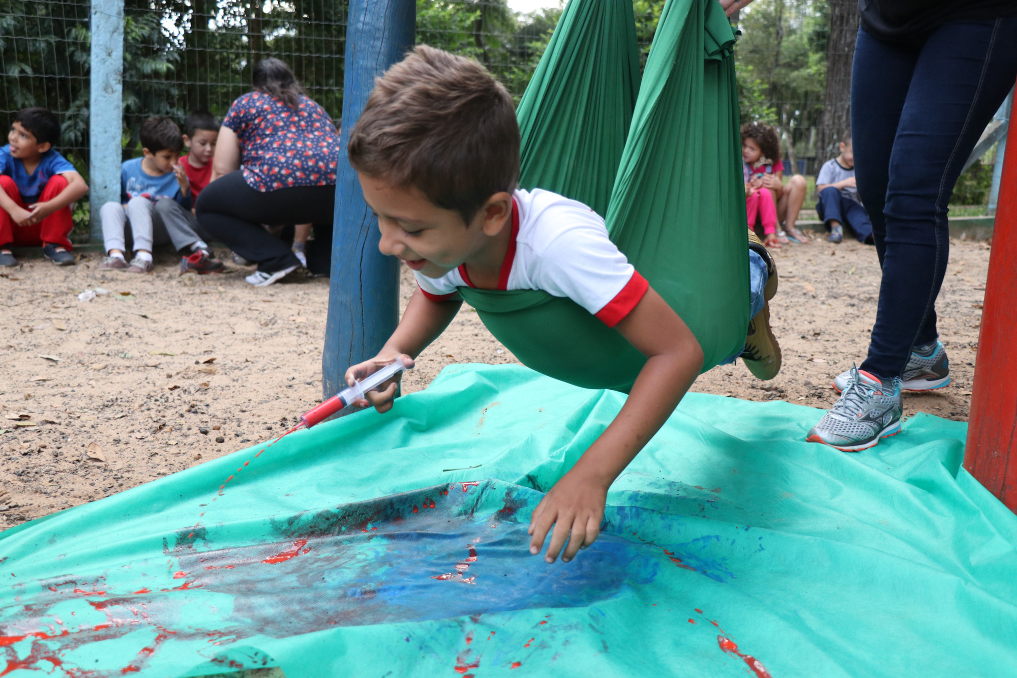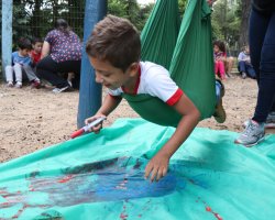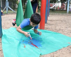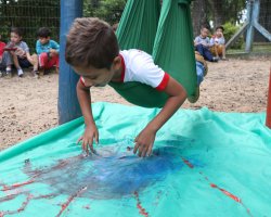Chapecó, 02/05/2019, quinta-feira A experiência encantadora de pintar voando. Essa foi a principal atividade do projeto A Arte do desenho e Pintura realizado no Centro de Educação Infantil Municipal Maria Helena Alves Chagas no bairro Parque das Palmeiras em Chapecó com os alunos do pré-escolar. Pendurados em tecido de elastano as crianças ficaram se balançando e espalharam a tinta com seringas, pincéis em um tnt, resultando em uma obra coletiva. Diferentes suportes de pintura foram utilizados no decorrer do projeto como tela, papel, lixa e tecido com o objetivo de proporcionar situações de aprendizagem que permitam fazer com que as crianças desenvolvam habilidades envolvendo o desenho e a pintura, contribuindo também para a manifestação da imaginação e estimulando a criatividade.