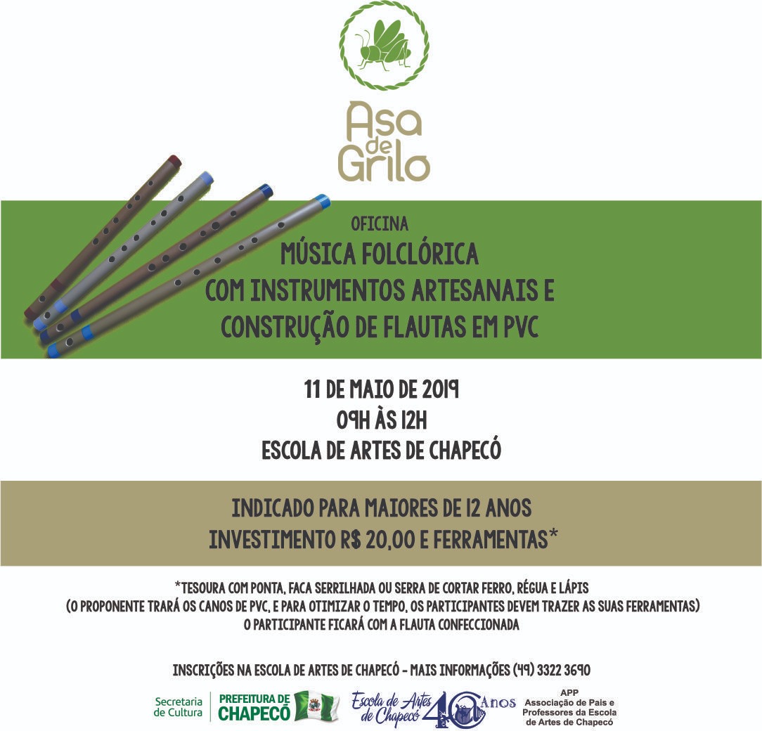 Chapecó, 09/05/2019, quinta-feira A Escola de Artes de Chapecó oferecerá no dia 11 de maio (sábado), das 09 às 12 horas a oficina Música folclórica com instrumentos artesanais e construção de flautas em PVC. As inscrições podem ser realizadas na Escola de Artes com um custo de R$ 20. Para participar é preciso ter no mínimo 12 anos. Cada participante ficará com a flauta que construiu e precisam trazer alguns materiais que auxiliarão no desenvolvimento da oficina: tesoura com ponta, faca serrilhada ou serra de cortar ferro, régua e lápis. Mais informações (49) 3322-3690.