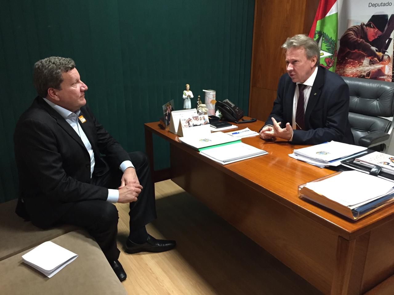 Outra audiência foi com o Deputado Federal, Celso Maldaner para buscar recursos para a conclusão do Ginásio de Esportes do Loteamento Alice e também da obra de modernização do Complexo Esportivo do Verdão. Além disso, a conversa também foi para articular a liberação de recursos de R$ 1 milhão para realização de mutirão de cirurgias eletivas.