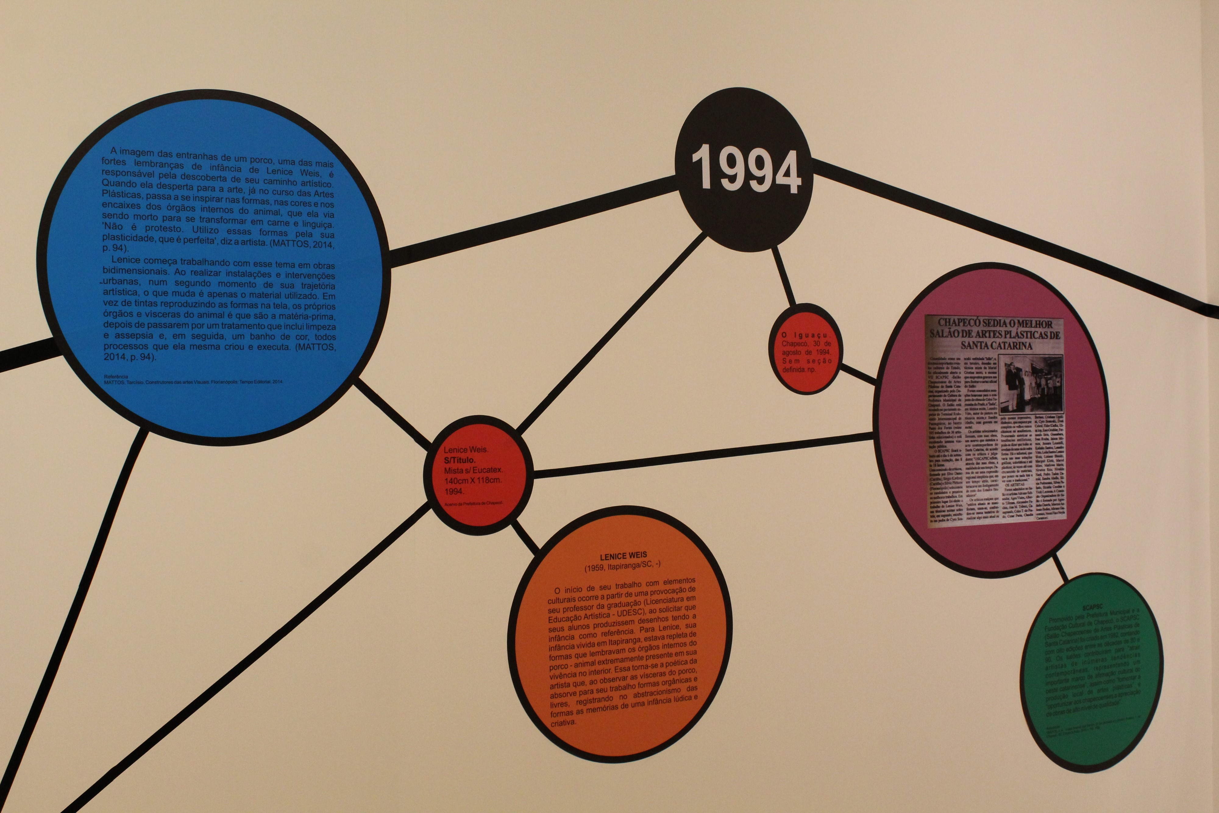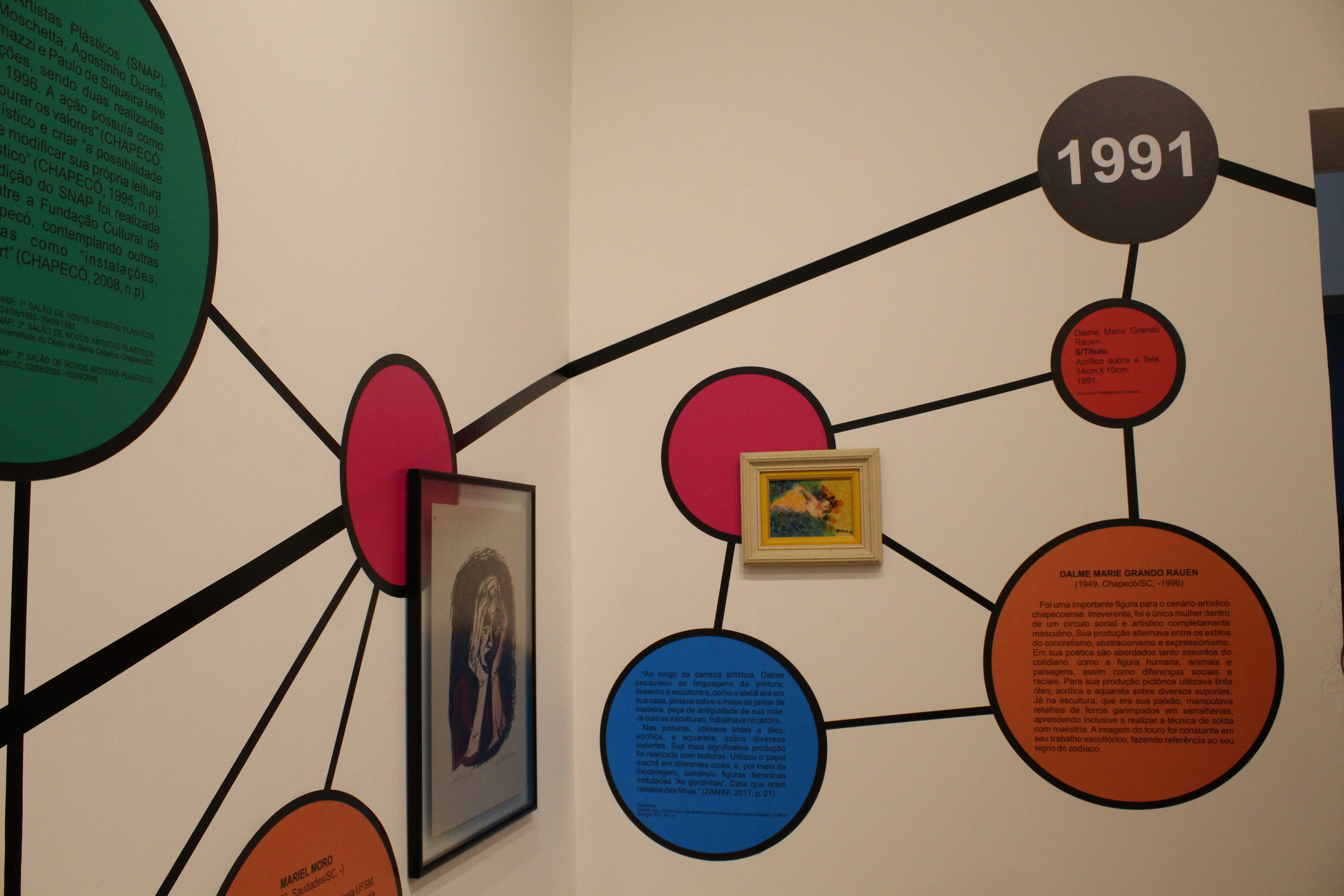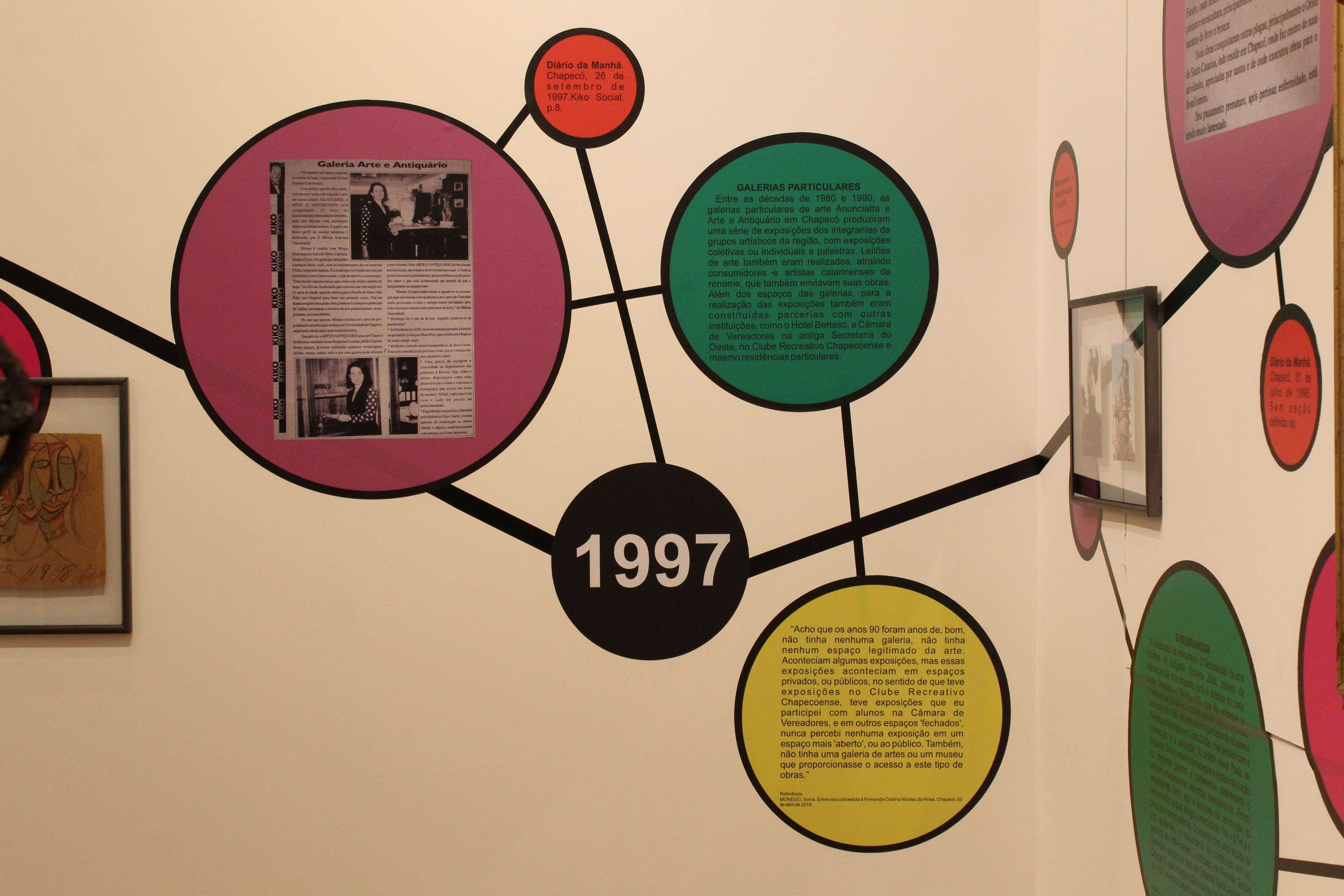 Chapecó, 15/05/2019, quarta-feira A programação da 17ª Semana Nacional dos Museus 2019 em Chapecó tem como principal atividade a Exposição de Artes Visuais ARTES VISUAIS EM CHAPECÓ NA DÉCADA DE 1990: uma abordagem cartográfica, apresenta a produção de artistas que atuaram em Chapecó, com curadoria de Ricardo de Pellegrin (Ricardo Garlet). A exposição propõe a pesquisa e a divulgação dos artistas locais que atuaram no período entre 1990 e 2000, empregando como recorte o acervo de obras das galerias e dos Museus da Prefeitura de Chapecó. A expografia da mostra foi motivada pelo conceito de cartografia, onde os dados, as entrevistas, os documentos e as obras estão dispostos no espaço em uma organização visual que permite agrupar as informações por tipologia e simultaneamente propõe conexões e leituras diversas a partir de qualquer ponto da exposição.