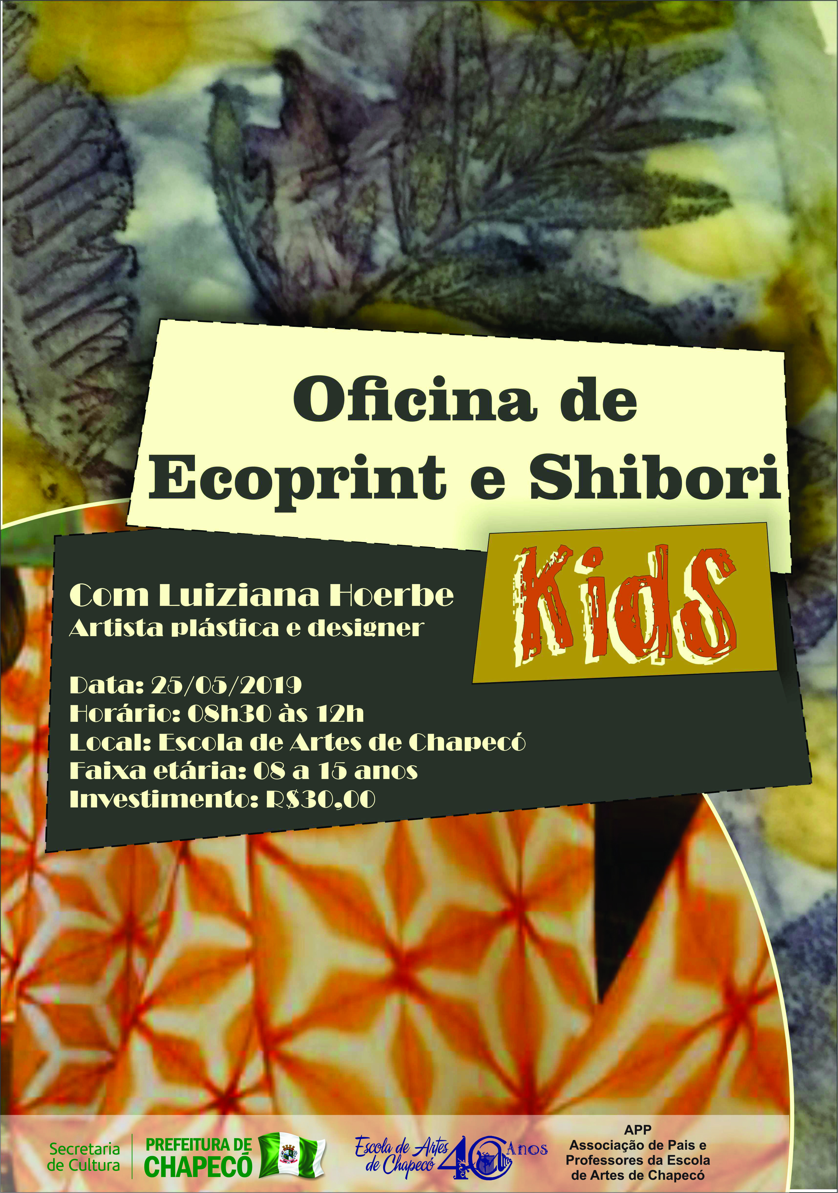 Chapecó, 16/05/2019, quinta-feira A Escola de Artes de Chapecó, oferece no sábado (25) uma oficina de Ecoprint Impressão botânica e shibori, ministrada por Luiziana Hoerbe. O objetivo é oferecer uma experiência ecológica acerca da estamparia têxtil utilizando apenas de plantas, respeitando o ritmo da natureza e suas sutilezas. A intenção é que os participantes percebam que existem formas mais limpas de produção dos artigos que consumimos diariamente e se atentem para formas mais sustentáveis de consumir estes produtos.