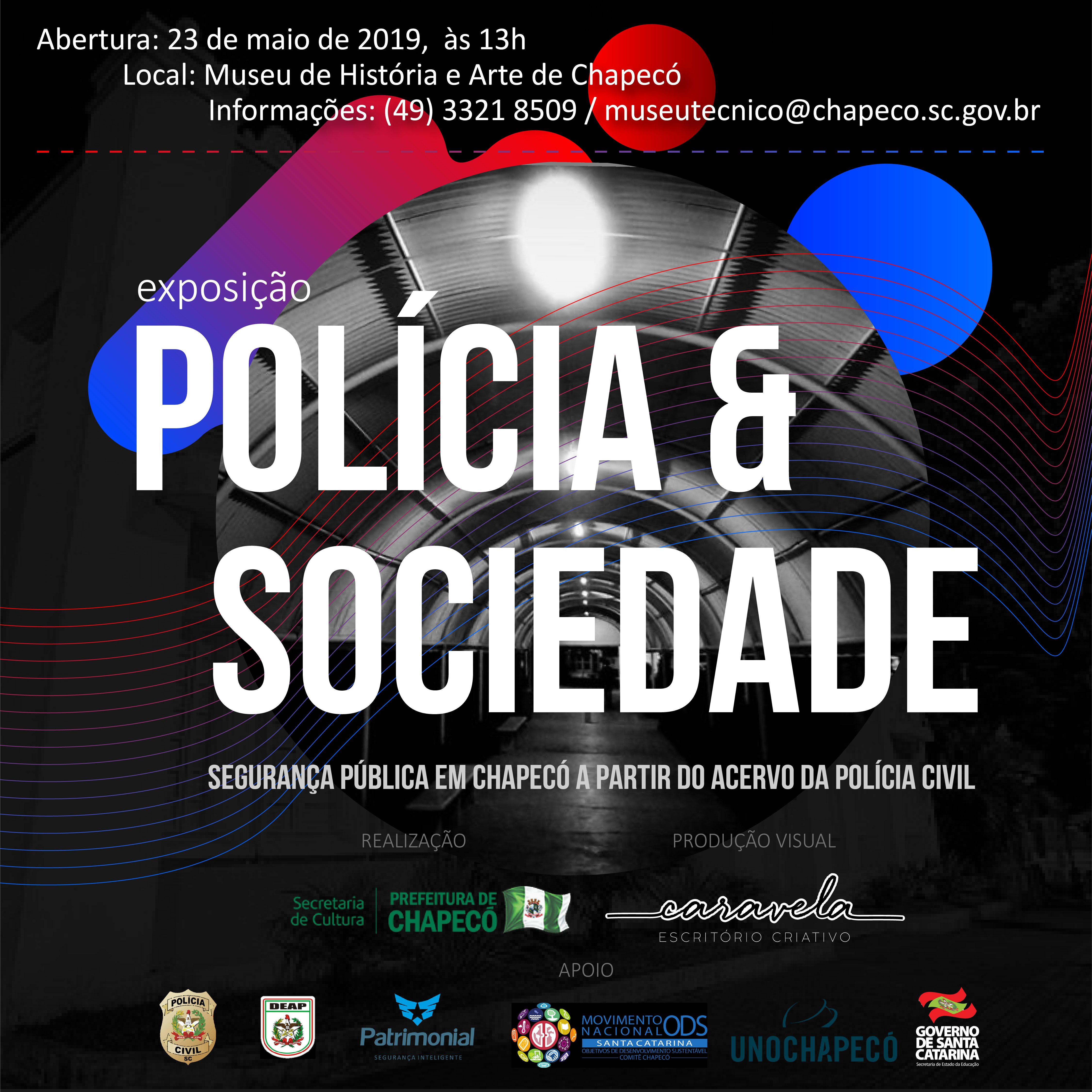 Chapecó, 21/05/2019, terça-feira Inicia em Chapecó, nesta quinta-feira (23), no Museu de História e Arte de Chapecó, a Exposição Polícia & Sociedade. O objetivo é promover um diálogo com a comunidade sobre a temática da segurança pública, focando alguns aspectos históricos e contemporâneos sobre o tema que leve o público visitante a superar as concepções do senso comum sobre a temática. O agendamento de visita à exposição com mediação para grupos pode ser realizada pelo telefone (49) 3321 8509 ou pelo e-mail museueducativo@chapeco.sc.gov.br. A exposição pode ser visitada de segunda à sexta-feira, das 8h às 18h. Sábados, domingos e feriados, das 14h às 17h.