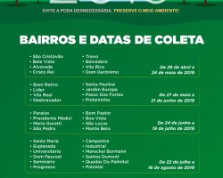 - Coleta de galhos nos bairros São Cristóvão, Bela Vista, Alvorada, Cristo Rei, Trevo, Belvedere, Vila Rica e Dom Gerônimo, conforme programação em anexo;