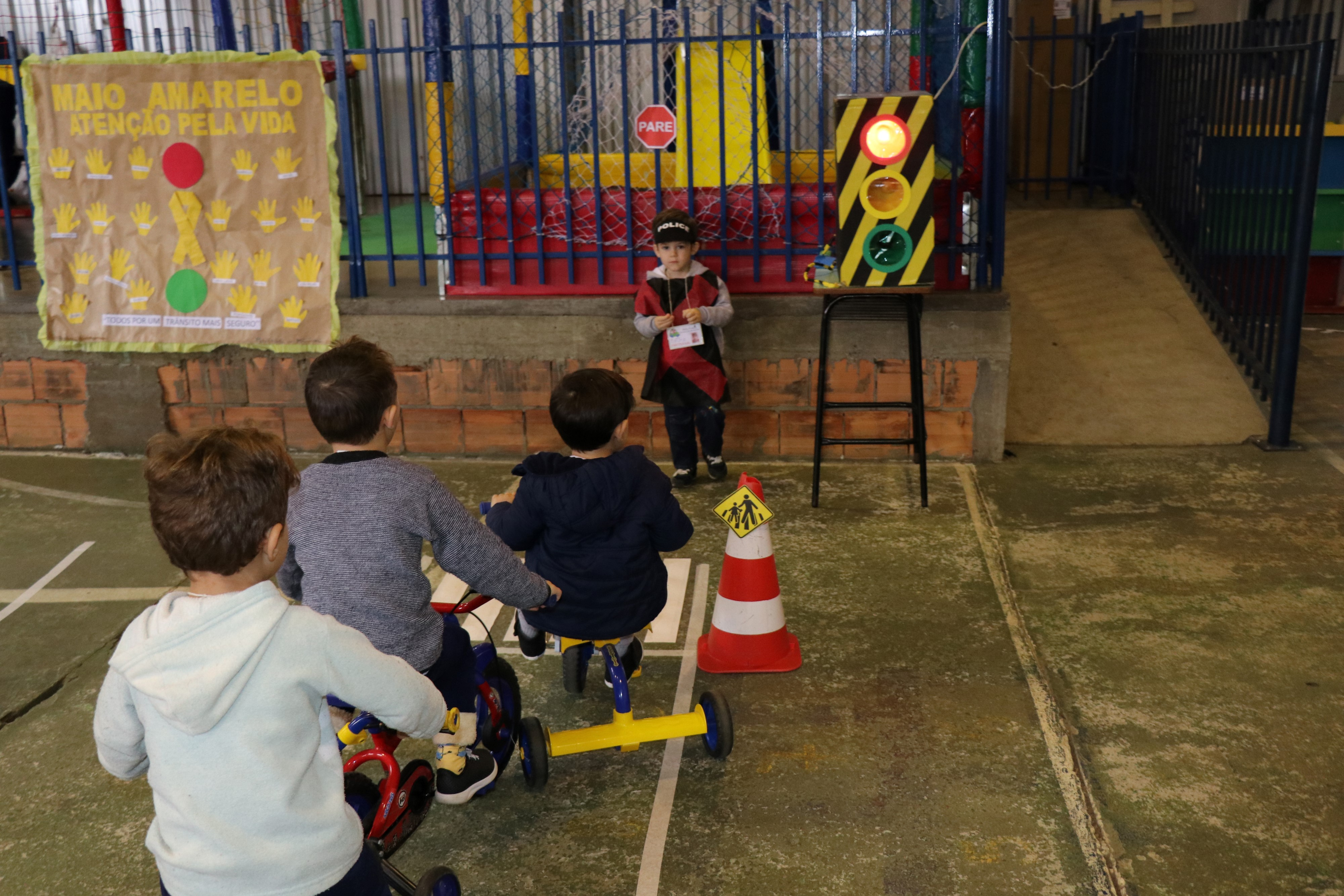 A professora Cristine Ferreira da Silva trabalhou a história O trânsito no mundinho, dramatizando momentos importantes. Após os alunos confeccionaram cartazes sobre esta história com frases sobre o trânsito. Também criaram, para cada criança, a sua carteira de motorista. Explicamos o que era a carteira de motorista e que quando tivessem 18 anos poderiam ter uma verdadeira, as crianças adoraram relata a professora. Eles também assistiram vídeos educativos sobre a Campanha Maio Amarelo. Desta forma puderam conhecer a importância das placas de trânsito, dos semáforos, das faixas de segurança, do uso obrigatório do cinto e da cadeirinha de segurança.