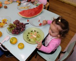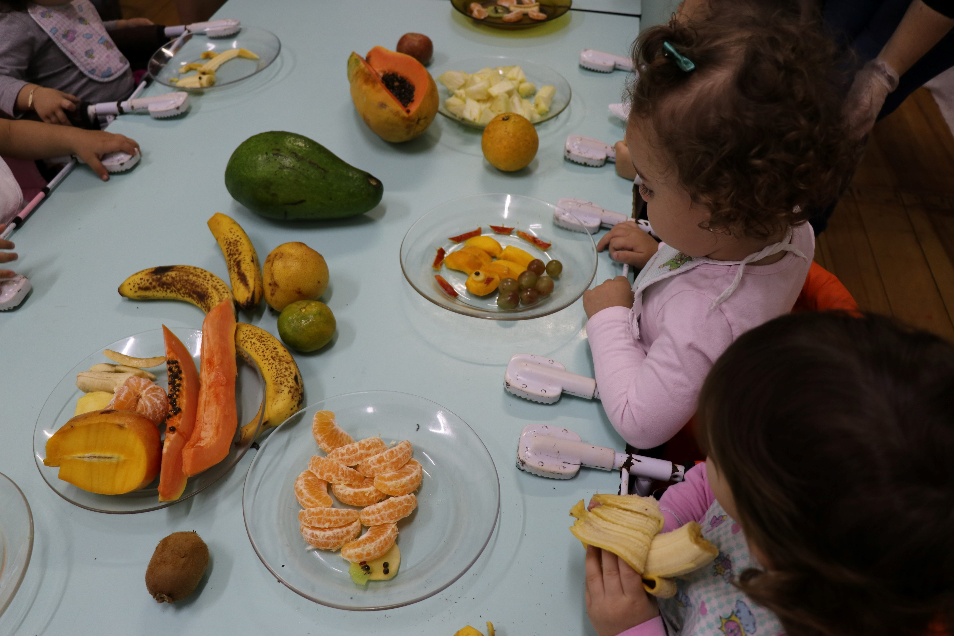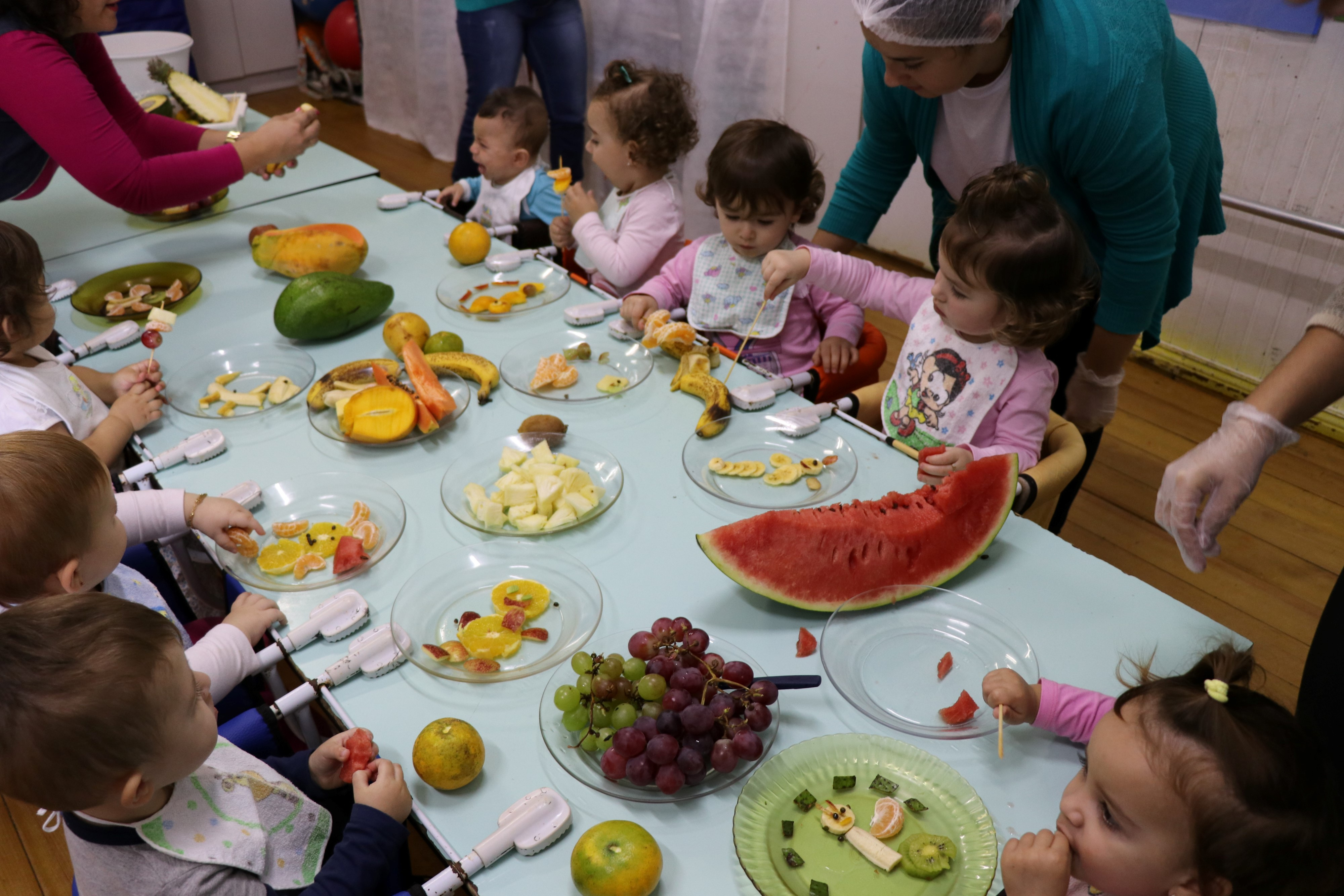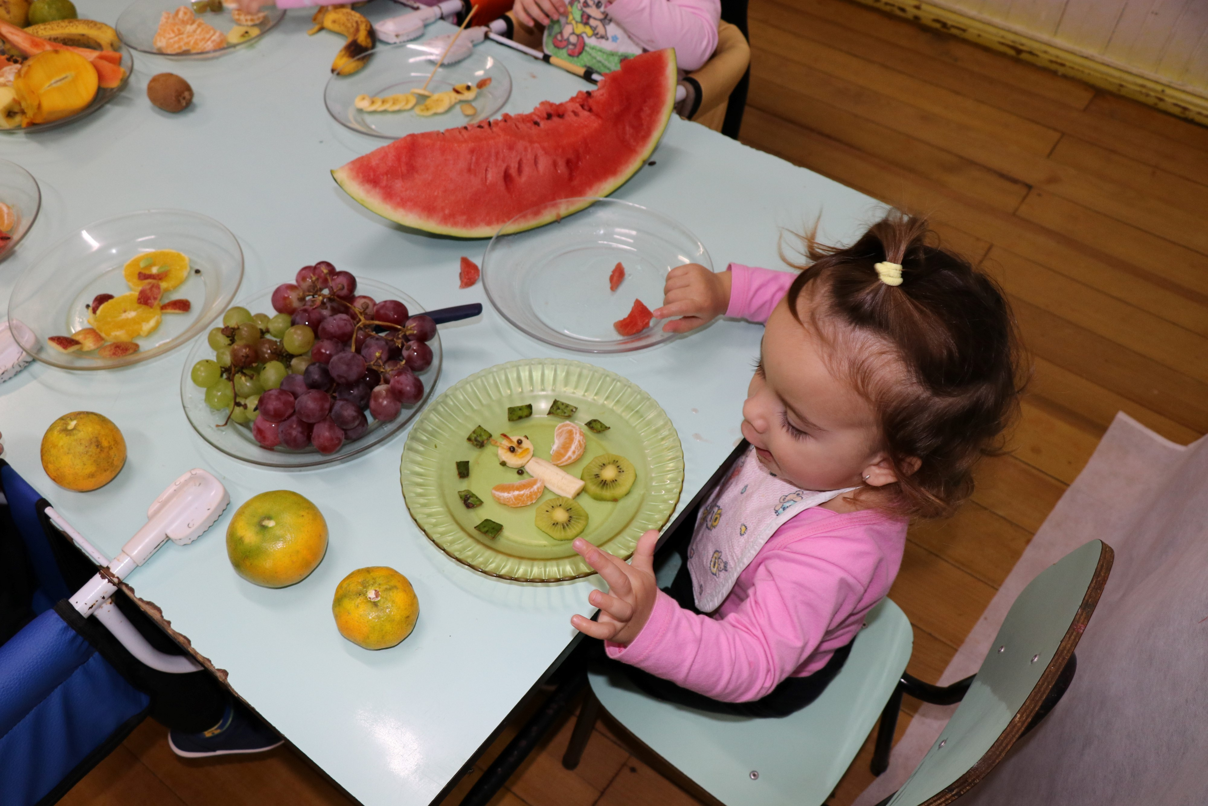 A atividade que foi apresentada para as crianças foi a confecção de um boneco em formato de quebra-cabeça onde seus membros são confeccionado com diferentes frutas associadas para formação o corpo saudável do mascote. Em seguida, com diferentes frutas e com a mediação da professora as crianças formaram um boneco para si dentro do prato e ao final podendo degustar este boneco saudável. De acordo com a professora Veridiana Maria Giachini Gollo a ideia era trabalhar a temática alimentação saudável com as crianças. Eu queria com esta proposta de atividade fazer com que as crianças não só recebessem as frutas prontas picadas ou em papas como é sempre ofertada a elas, mas que elas manuseassem, sentissem, que aquilo fizesse sentido, comentou.