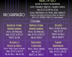 No domingo (14/07) a partir das 15 horas no hall da Escola de Artes acontecerá o Entrevero musical com apresentações de música locais. Além disso, todas as oficinas e recitais acontecerão na sede da Escola de Artes.