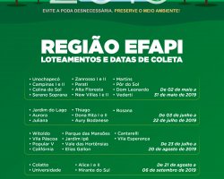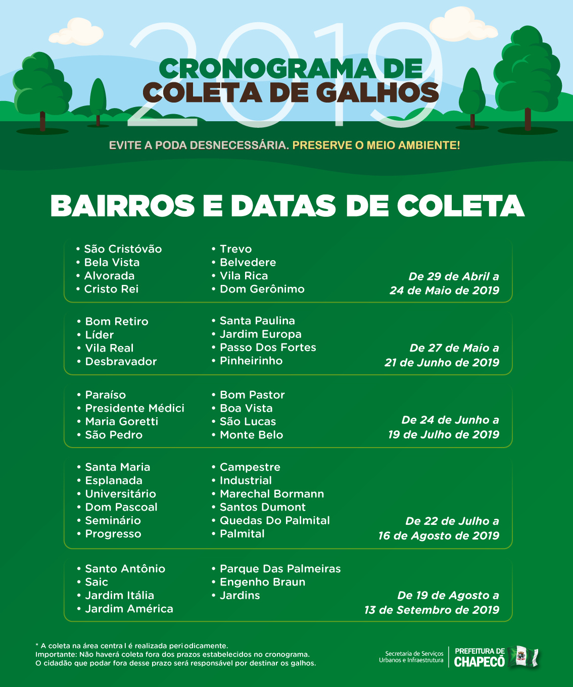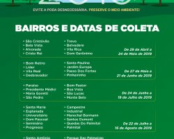 - Coleta de galhos nos bairros Paraíso, Presidente Médici, Maria Goretti, São Pedro, Bom Pastor, Boa Vista, São Lucas e Monte Belo, conforme programação do site;