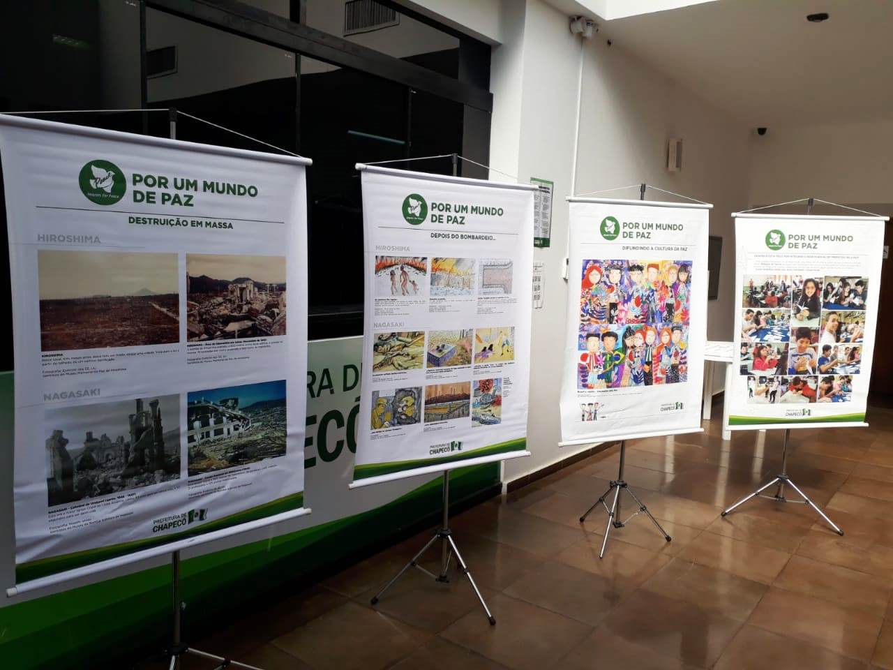 Em agosto de 2019 a destruição das cidades de Hiroshima e Nagasaki pela bomba atômica completa 74 anos. Por isso, milhares de cidades no mundo estão unidas e engajadas na abolição das armas nucleares. Chapecó também está mobilizada. A partir desta terça-feira (06-08), acontece a exposição de banners Por um Mundo de Paz, no hall da sede da Prefeitura de Chapecó, na Avenida Getúlio Vargas. A ação ilustra o efeito devastador do bombardeio atômico no Japão em 1945, além de registros do engajamento de Chapecó em atividades pela Paz.