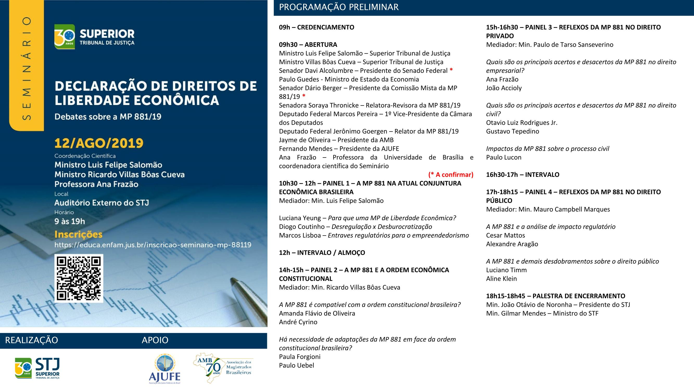O primeiro painel, às 10h30, abordará "A MP 881/2019 na atual conjuntura econômica brasileira", com mediação do ministro Luis Felipe Salomão. Com o tema "A MP 881 e a ordem econômica constitucional", o segundo painel será mediado pelo ministro Villas Bôas Cueva. O ministro Paulo de Tarso Sanseverino mediará o painel "Reflexos da MP 881 no direito privado". O quarto e último painel terá a mediação do ministro Mauro Campbell Marques e tratará dos "Reflexos da MP 881 no direito público". O encerramento do seminário contará com a presença do presidente do tribunal, ministro João Otávio de Noronha, e uma palestra do ministro do Supremo Tribunal Federal (STF) Gilmar Mendes. Chapecó, 09/08/2019, sexta-feira. (Com informações do STJ).