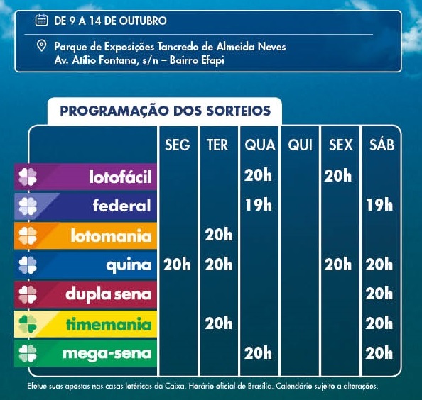 A programação completa dos sorteios também pode ser conferida no portal da CAIXA: www.caixa.gov.br/loterias