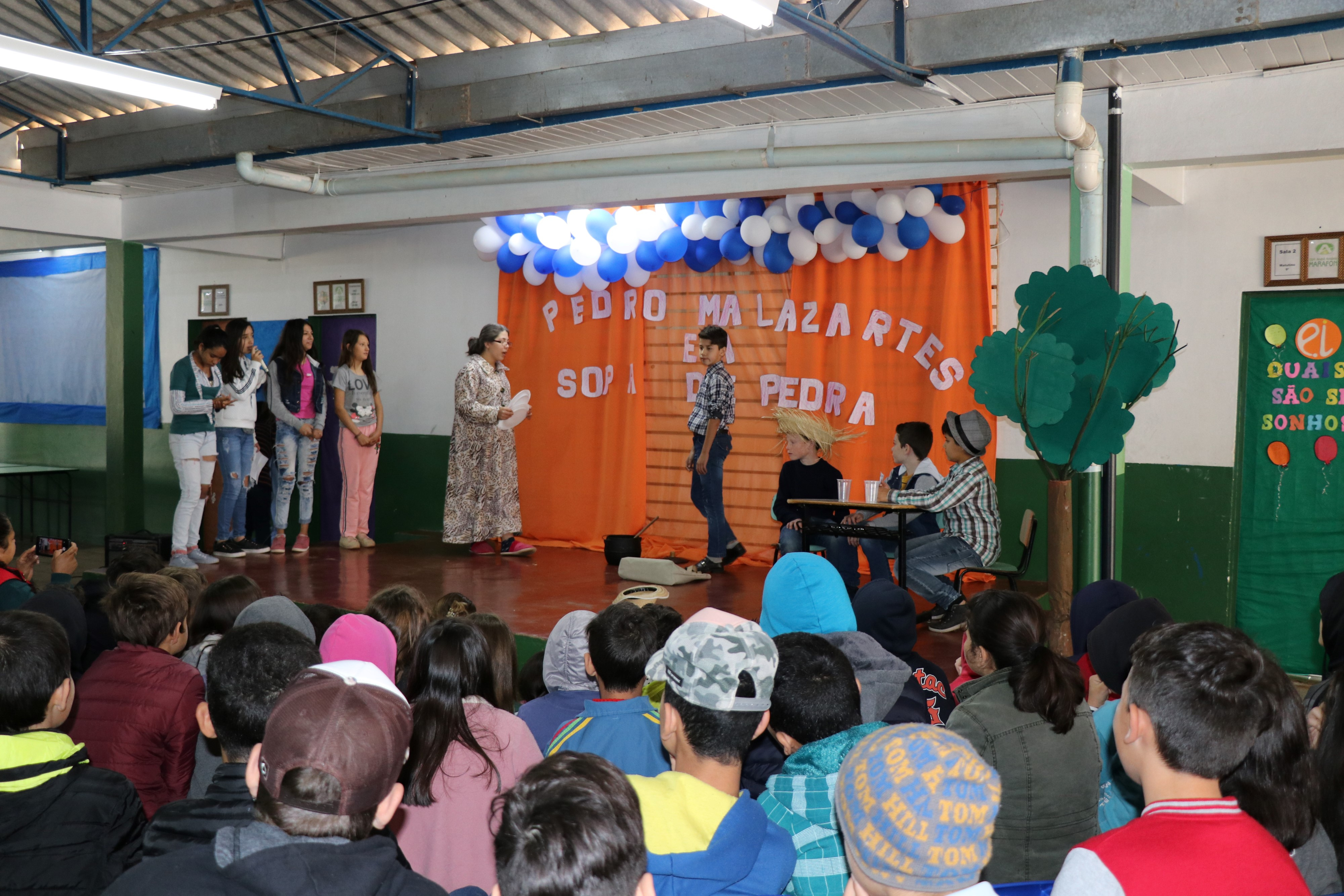 Chapecó, 21/08/2019, quarta-feira Os estudantes da Escola Básica Municipal Olímpio Corrêa Figueiró foram até a EBM André Antônio Marafon para apresentar duas peças de teatro. A construção do teatro surgiu a partir das aulas de leitura, que acontecem regularmente na EBM Olímpio Corrêa Figueiró, quando as professoras de Língua Portuguesa e de Arte lançaram o desafio aos alunos para que construíssem uma apresentação a partir das leituras realizadas. O Pequeno Príncipe de Saint-Exupéry foi a escolha dos alunos do 8º e 9º anos do ensino fundamental e do 6º ano foi a obra A Sopa de Pedra de Pedro Malazartes.