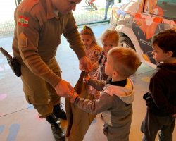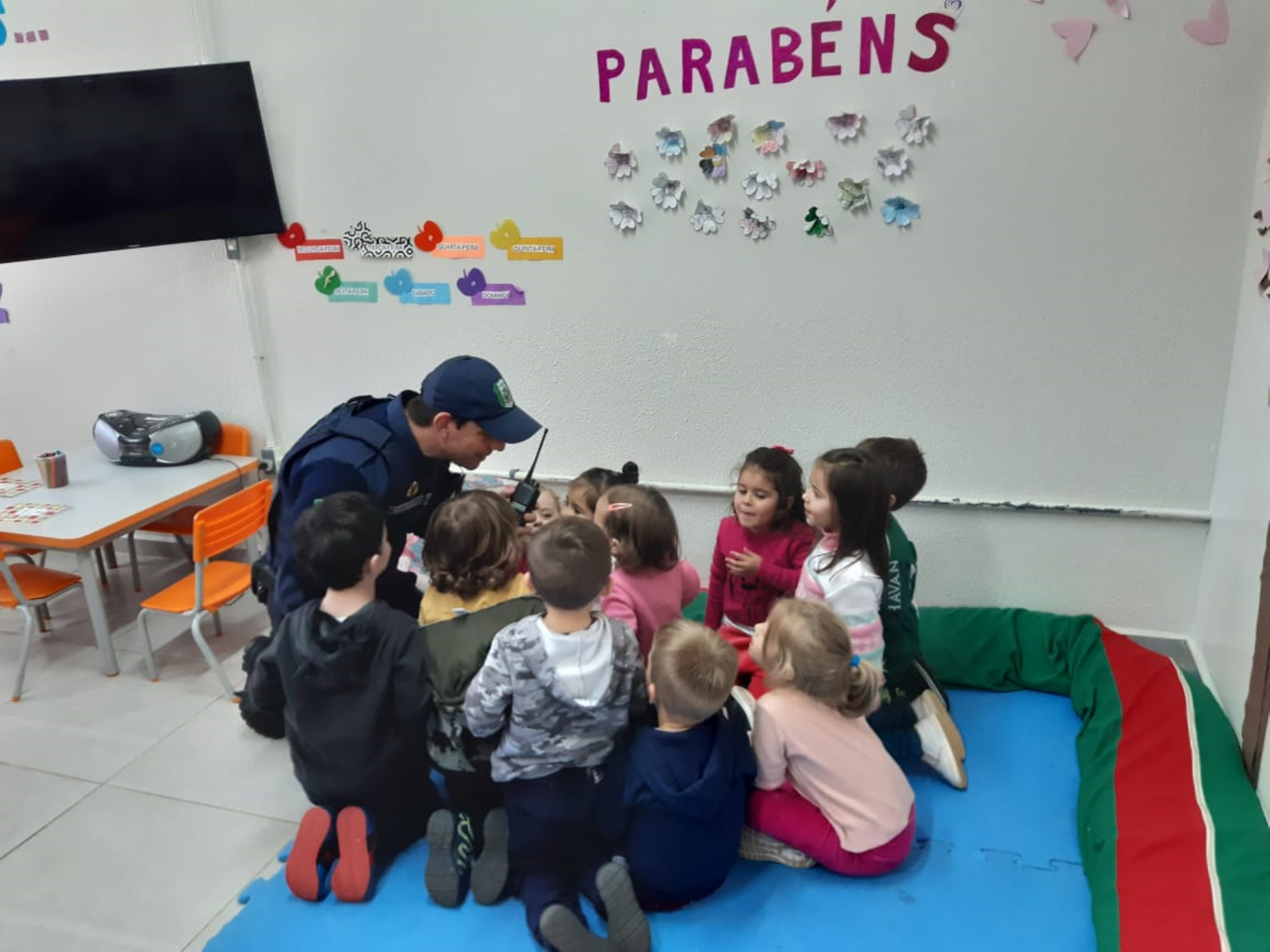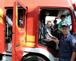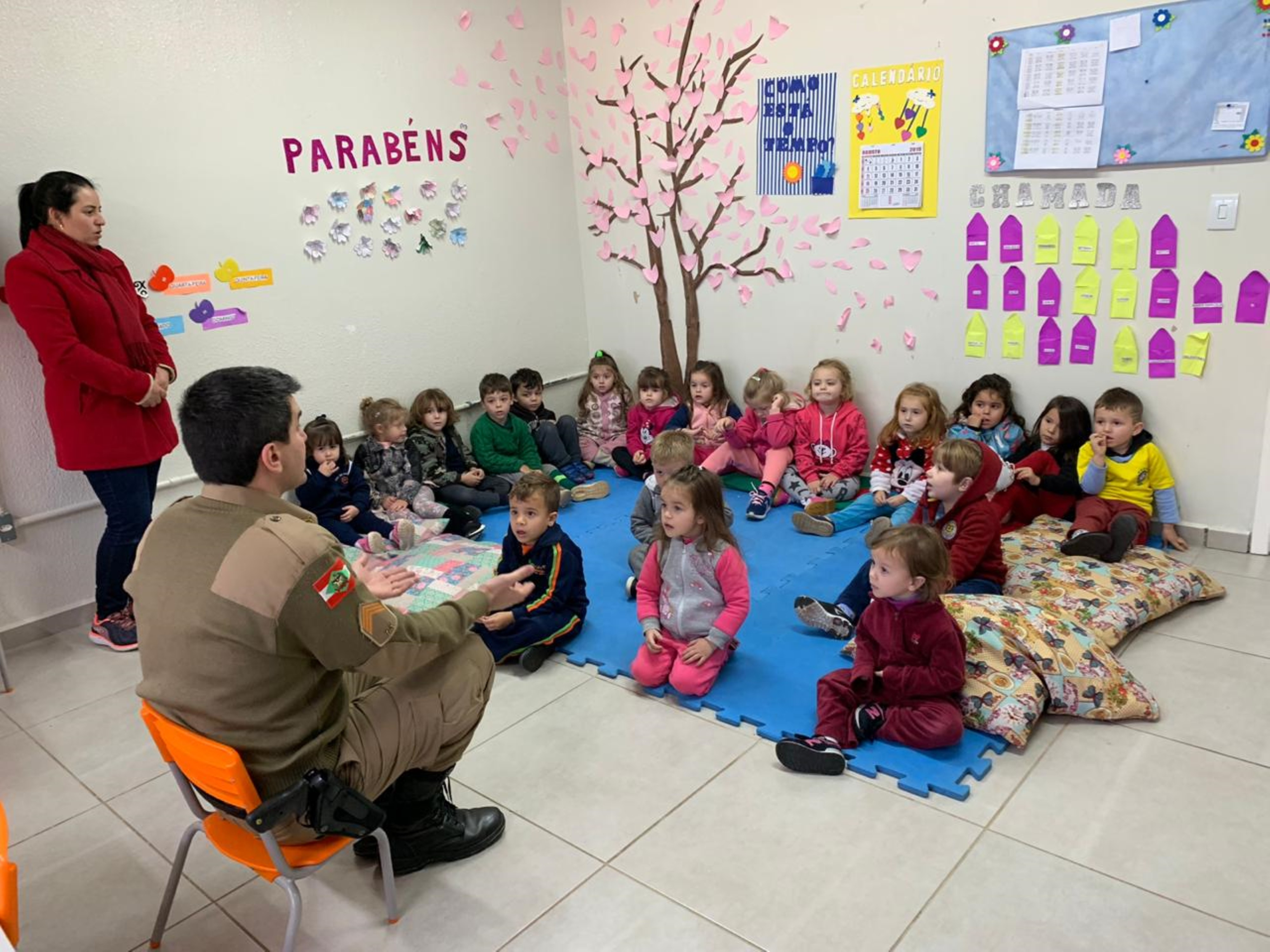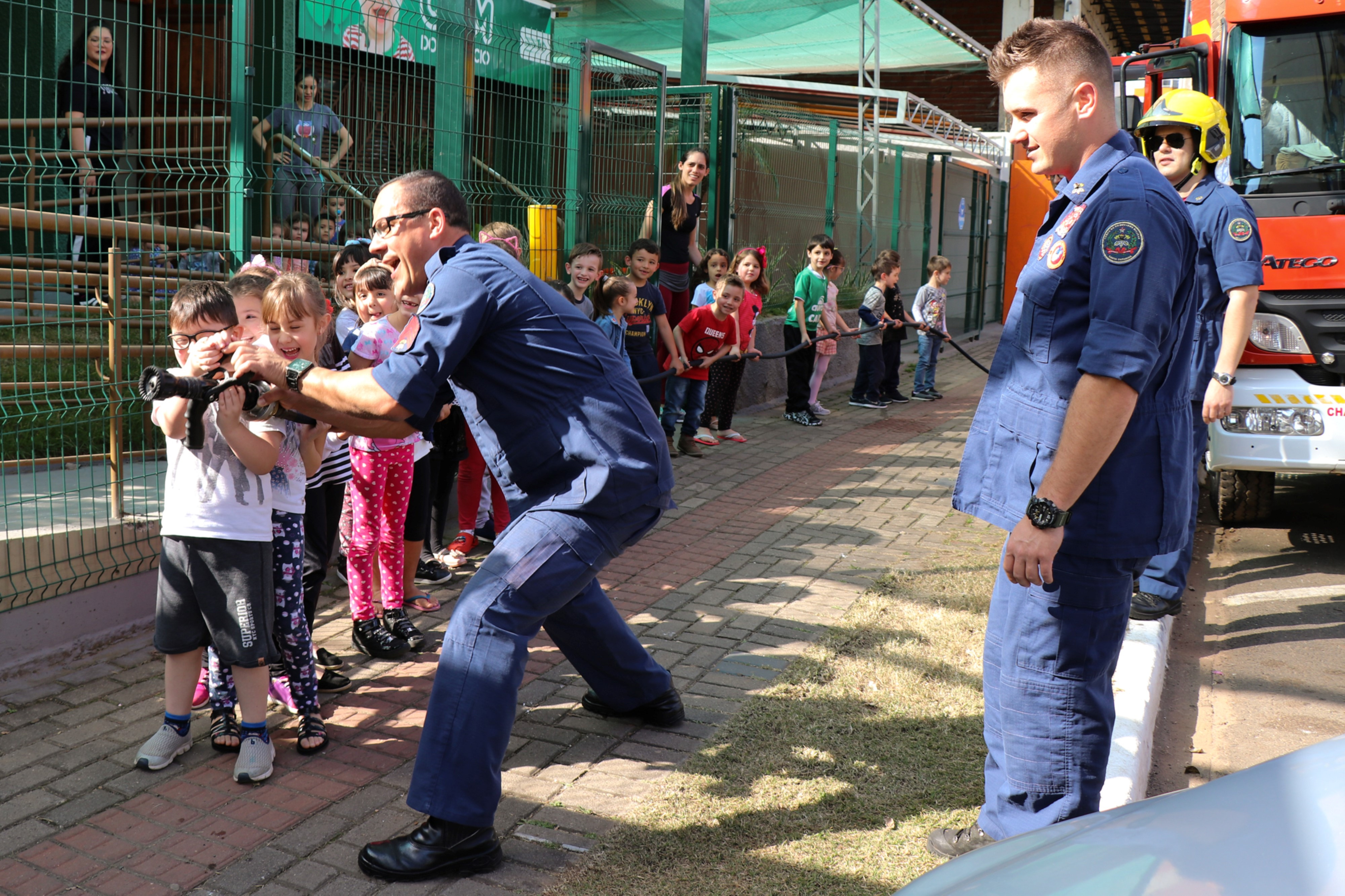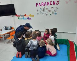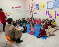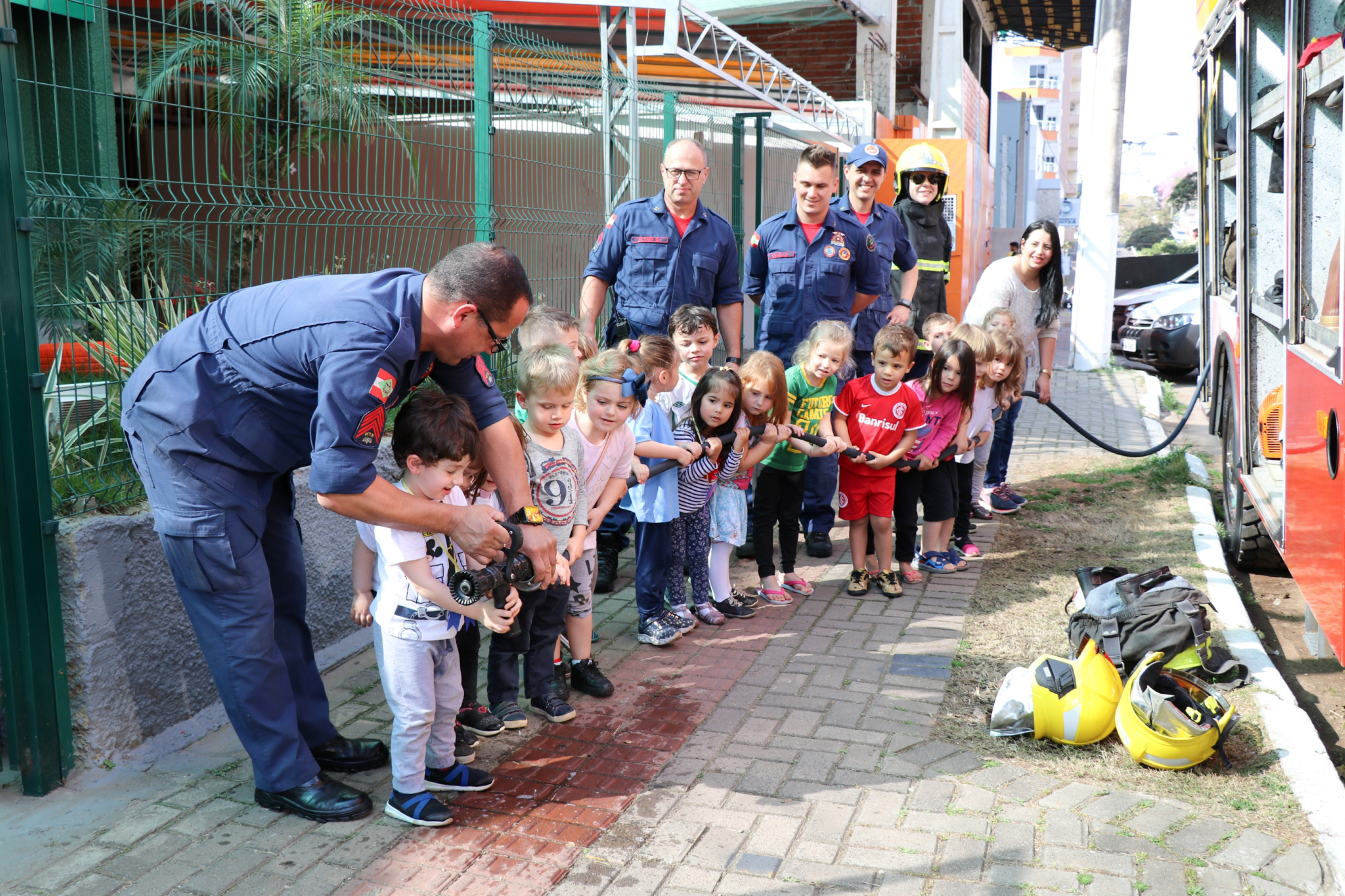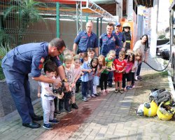 A turma do Maternal B desenvolveu o tema Heróis de Verdade sobre os profissionais que cuidam da nossa cidade os bombeiros, os policiais militares e os guardas municipais. Alguns representantes destas instituições foram até a escola para contar um pouco sobre o dia a dia da profissão, mostraram alguns materiais utilizados no trabalho e orientaram as crianças sobre algumas ações importantes para tornar a cidade melhor, fatos estes que despertaram o interesse dos alunos. Os bombeiros trouxeram o caminhão para mostrar às crianças e eles adoraram. Temos muitas ocorrências, mas sempre arrumamos um tempinho para que as crianças nos conheçam e conheçam um pouco da nossa profissão que é tão admirada por eles relata o Sargento Valter Luciano Hining. Sobre a experiência de conhecer a equipe de Bombeiros e o caminhão o aluno Antônio Carlos de Almeida de 4 anos, relata foi legal entrar no caminhão, eu gostei do barulho e a aluna Maria Marcela Santin de 3 anos relata adorei colocar o capacete, é bem pesado.