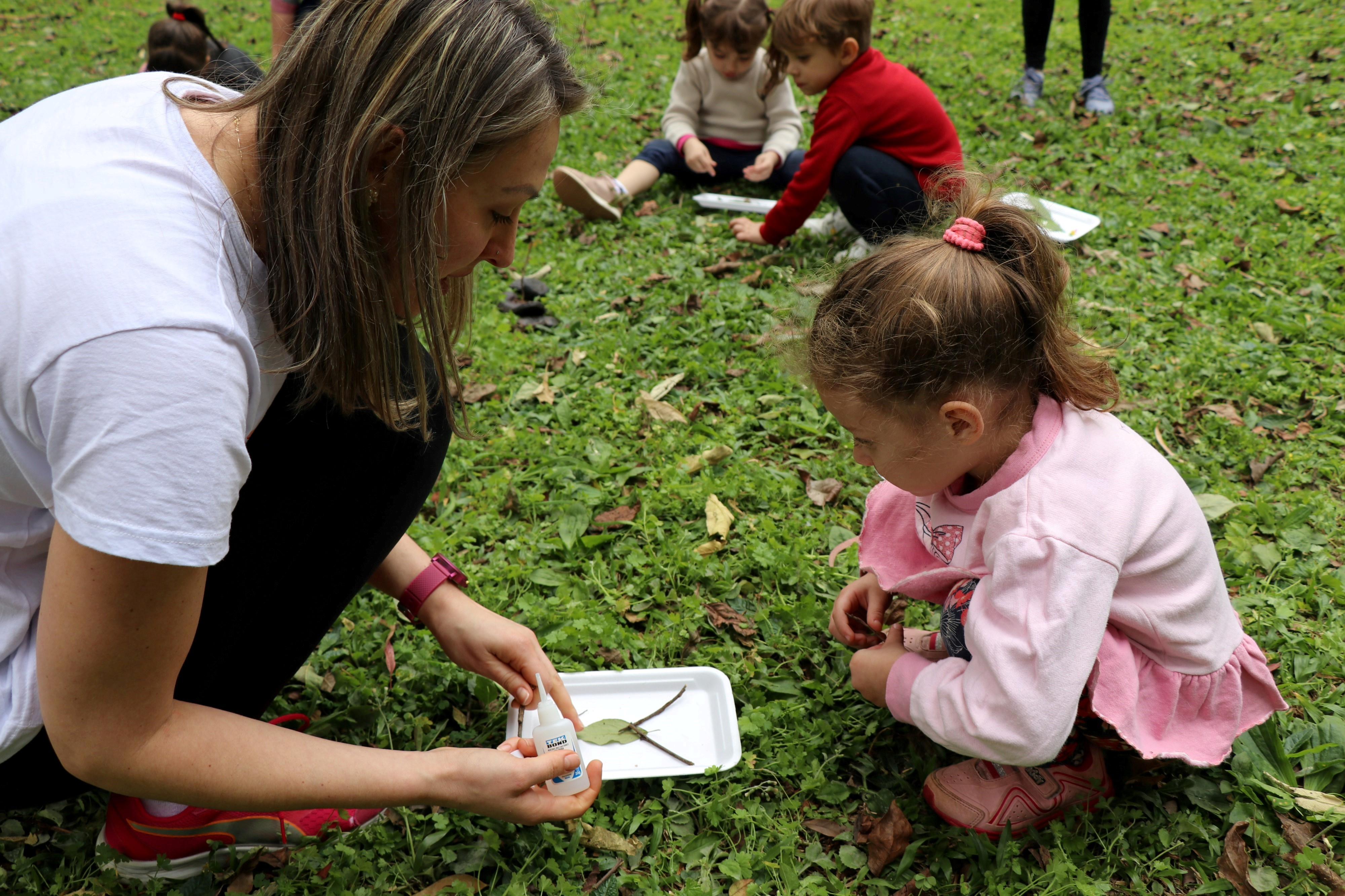 Também colaboraram na realização das atividades a professora regente da turma, estagiárias e a coordenadora. Na atividade de construção do corpo humano as professoras orientavam as crianças a coletarem folhas secas, galhos, pedras entre outros materiais disponíveis e depois explicaram como os pequenos poderiam construir o corpo humano com os elementos da natureza. As crianças demonstraram interesse e participaram ativamente. A aluna Alice Murara, de 4 anos, gostou de montar o corpo humano. “Eu fiz a cabeça e o tronco, está bem bonito”, disse. A aluna Heloísa Peron, de 3 anos, gostou da atividade ao ar livre. “Eu adoro este parque”, demonstrando ter muita energia para explorar o local.