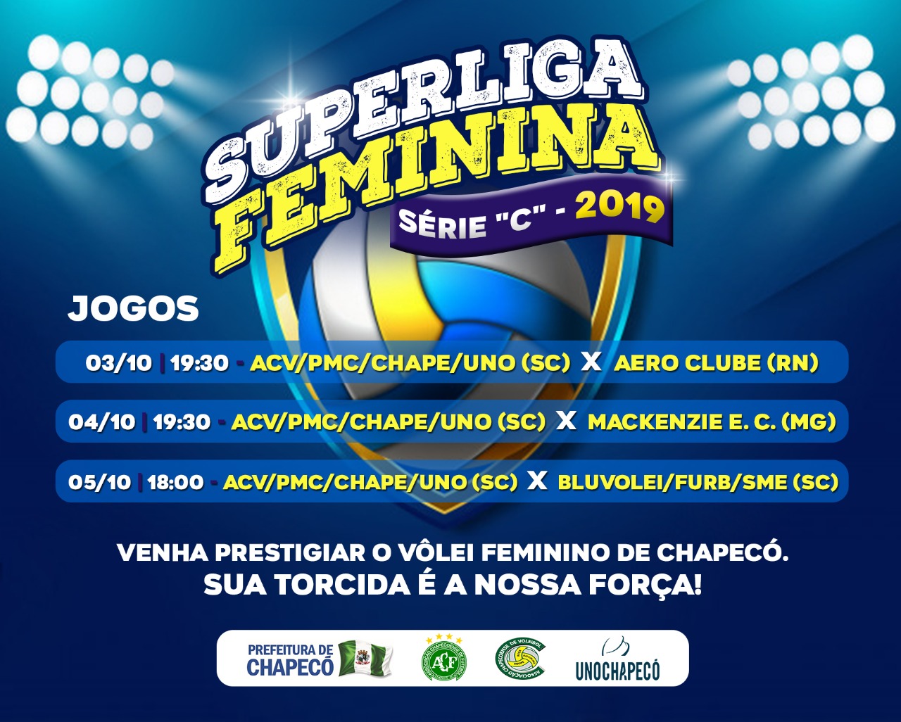Chapecó, 01/10/2019, terça-feira A Associação Chapecoense de Voleibol/ Prefeitura/ Unochapecó começa nesta quinta-feira (03/10) sua caminhada em busca de uma vaga para a Superliga B de Voleibol Feminino. Chapecó sedia a rodada inicial da Superliga Série C, com jogos até o próximo sábado (05/10). Os adversários da Chave B são os fortes times do Bluvolei de Blumenau, o Mackenzie Esporte Clube de Minas Gerais e o desconhecido Aero Clube do Rio Grande do Norte.