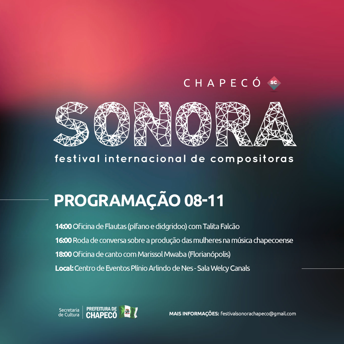 Chapecó, 17/10/2019, quinta-feira Estão abertas as inscrições para as oficinas que integram a programação do Sonora Festival Internacional de Compositoras de Chapecó. As atividades são gratuitas e acontecerão na sexta-feira, 08 de novembro, no Centro de Cultura e Eventos Plínio Arlindo De Nes, Rua Assis Brasil, 20-D. Em sua segunda edição o Festival, contemplado pelo Edital de Fomento e Circulação das Linguagens Artísticas de Chapecó, tem como objetivo democratizar o acesso às artes e oportunizar que mulheres, cis e trans, aprendam música, conheçam novas técnicas, tenham acesso ao conhecimento, à troca de experiências e à profissionalização.