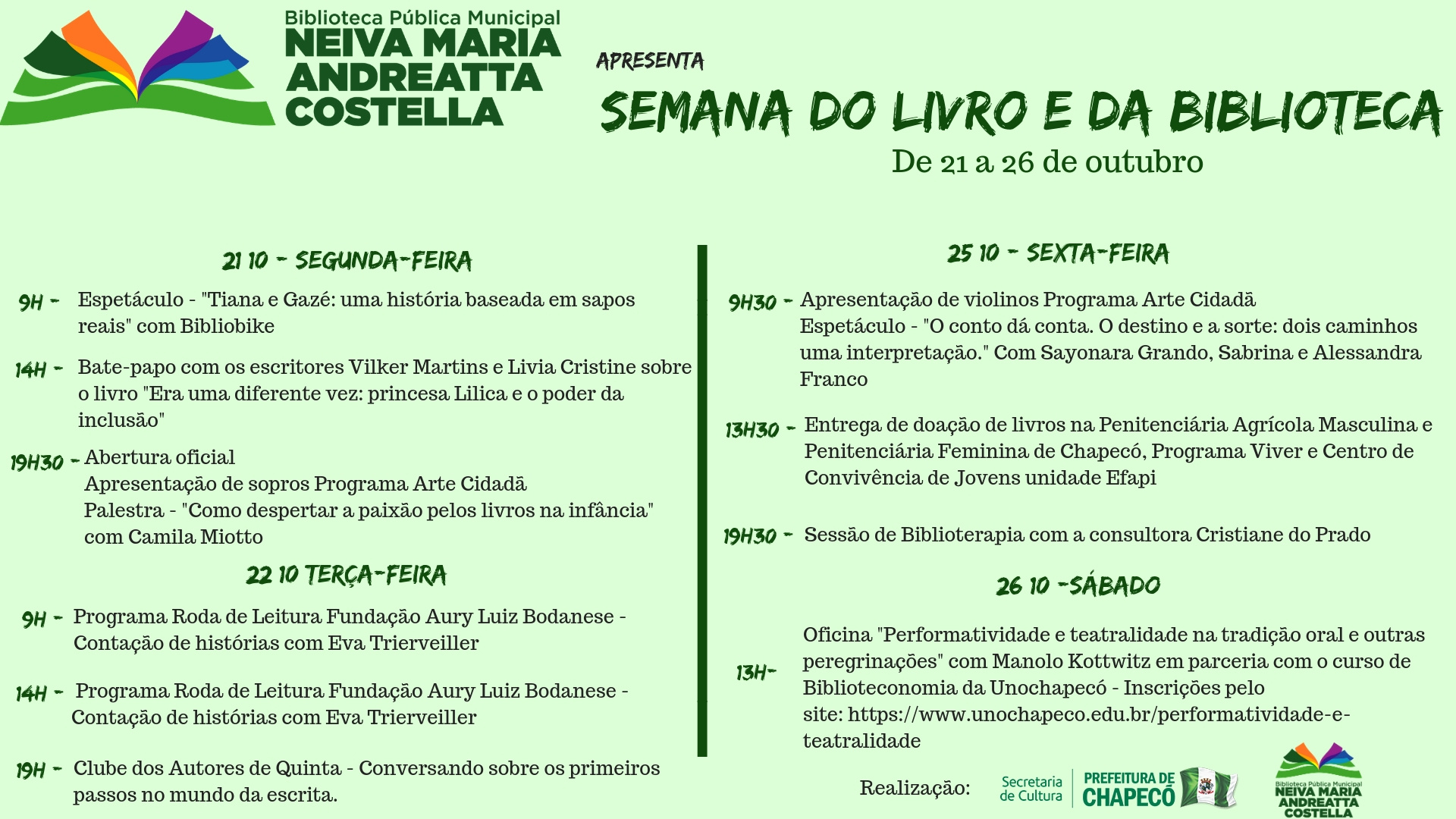 Chapecó, 18/10/2019, sexta-feira Inicia na segunda-feira (21) a Semana do Livro e da Biblioteca. A programação é organizada pela Administração Municipal, por meio da Secretaria de Cultura e da Biblioteca Pública Municipal Neiva Maria Andreatta Costella e seguirá até sábado (26).De acordo com Caroline Miotto, bibliotecária da Biblioteca Pública Municipal Neiva Maria Andreatta Costella a programação tem como objetivo fomentar o livro e a biblioteca e dar ênfase para que a comunidade entenda como ferramenta cultural e espaços culturais para serem aproveitados no dia a dia. Ela explica que de segunda à sexta-feira são gratuitas e abertas à comunidade. Para a atividade do sábado (26) precisa fazer a inscrição através do site da Unochapecó.