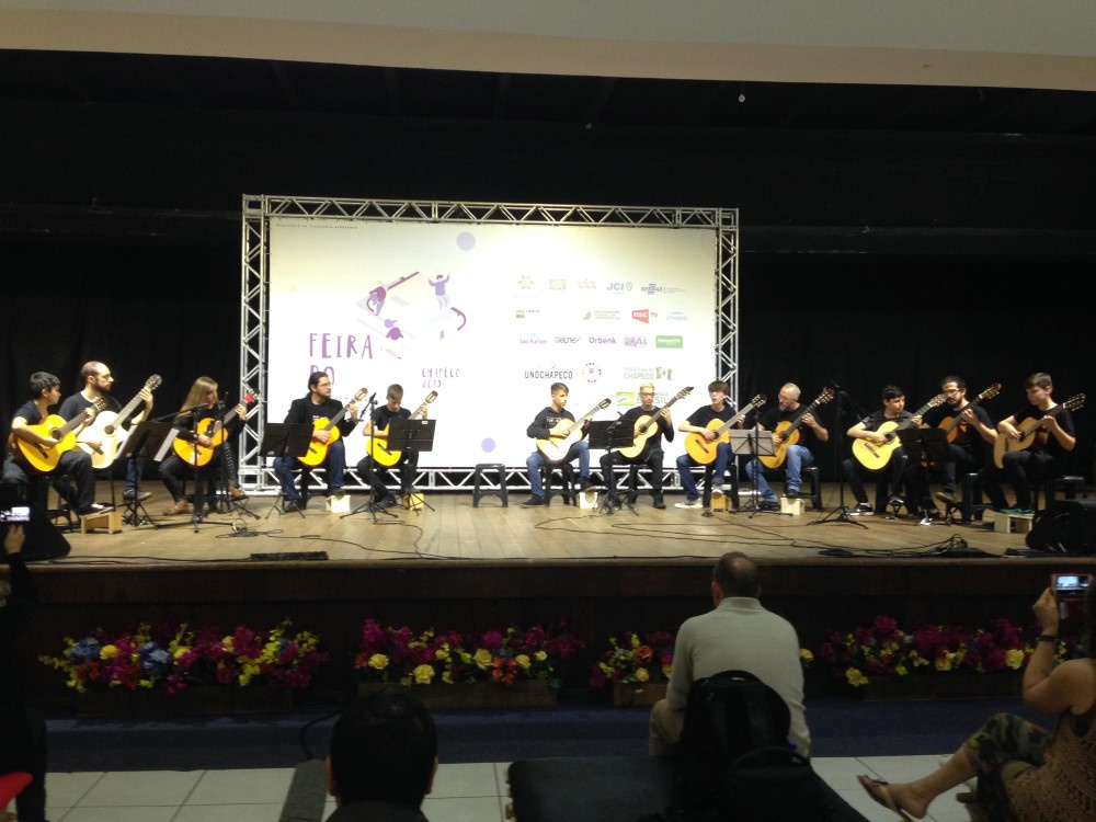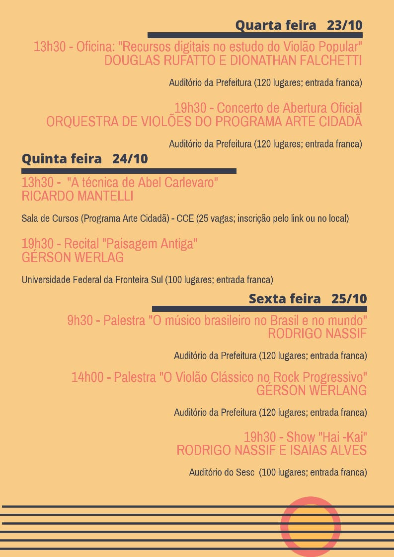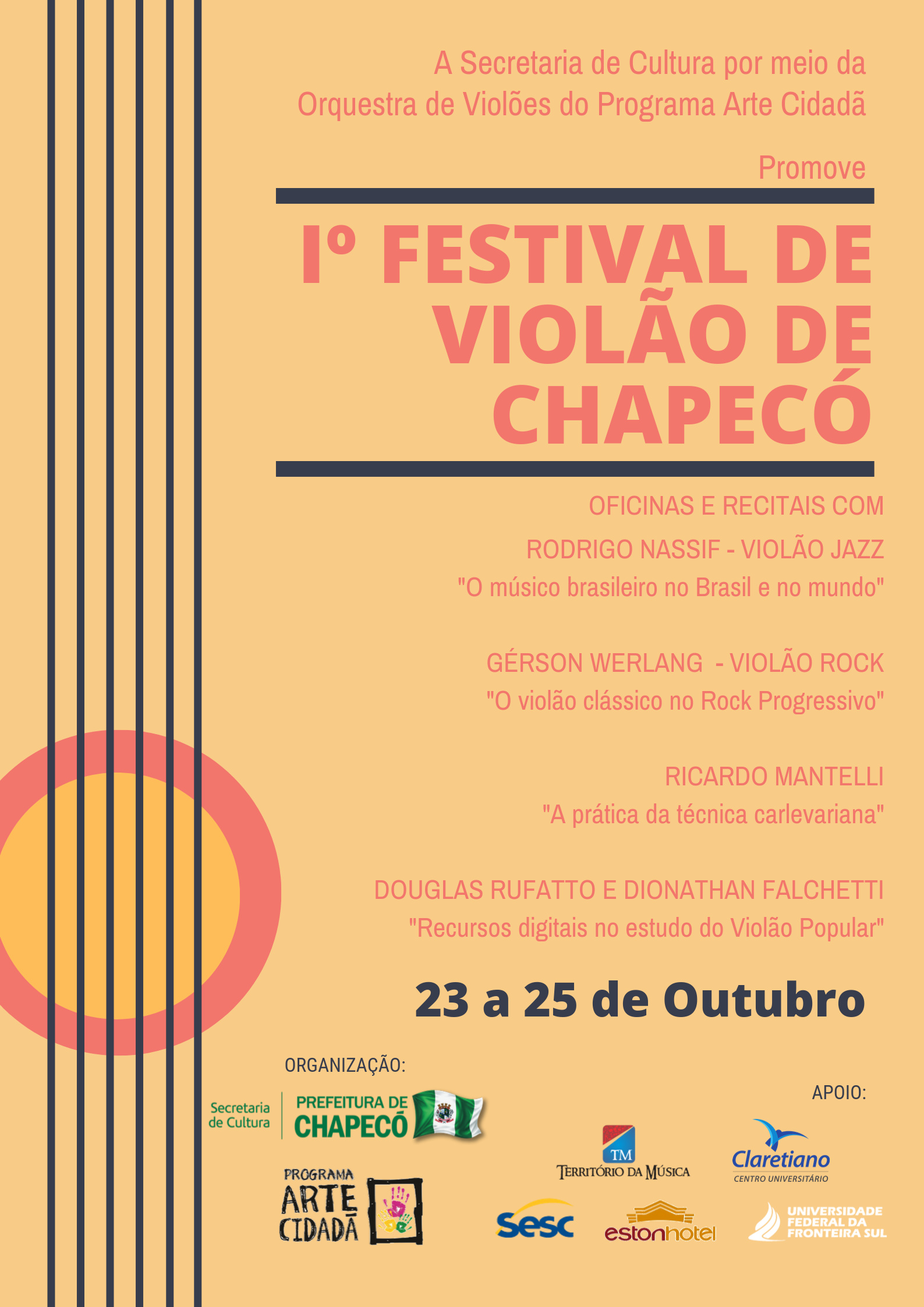 Chapecó, 21/10/2019, segunda-feira A Administração Municipal, por meio da Secretaria de Cultura, através da Orquestra de Violões do Programa Arte Cidadã, realiza de 23 a 25 de outubro o 1º Festival de Violão de Chapecó. O objetivo é proporcionar aos violonistas (profissionais, amadores e interessados) e público em geral de Chapecó e região um espaço para trocas de experiência e formação continuada na área do violão (erudito ou popular), estimulando a reflexão sobre as possibilidades didático-pedagógicas do instrumento. O evento também soma com a formação artística e cultural de futuros profissionais, com o pioneirismo na região e a inovação em termos de formato (concertos, oficinas e palestras).