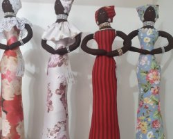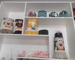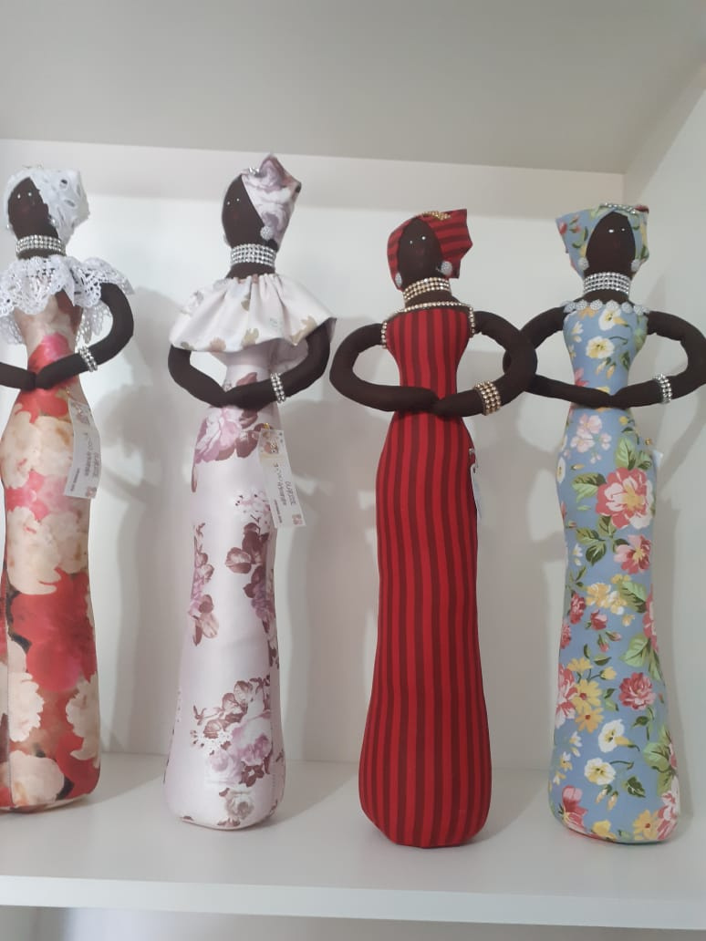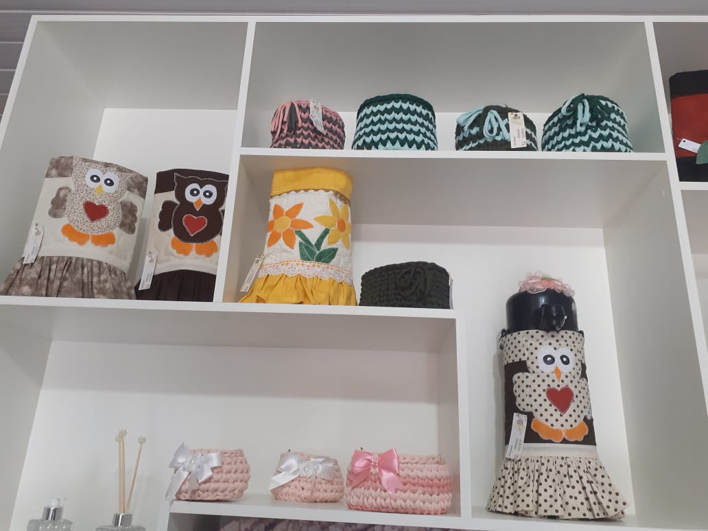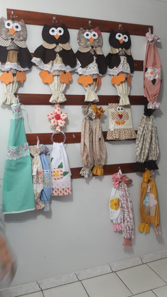 Ela trabalha com diversas peças em tecido e entre as técnicas utiliza o patchwork. Ela faz pesos de porta, puxa saco, capas de garrafas térmica, almofadas, panos de prato, porta prato, aventais, lixeiros para carro. Hoje o artesanato é sua atividade principal, além de já ser aposentada como enfermeira.