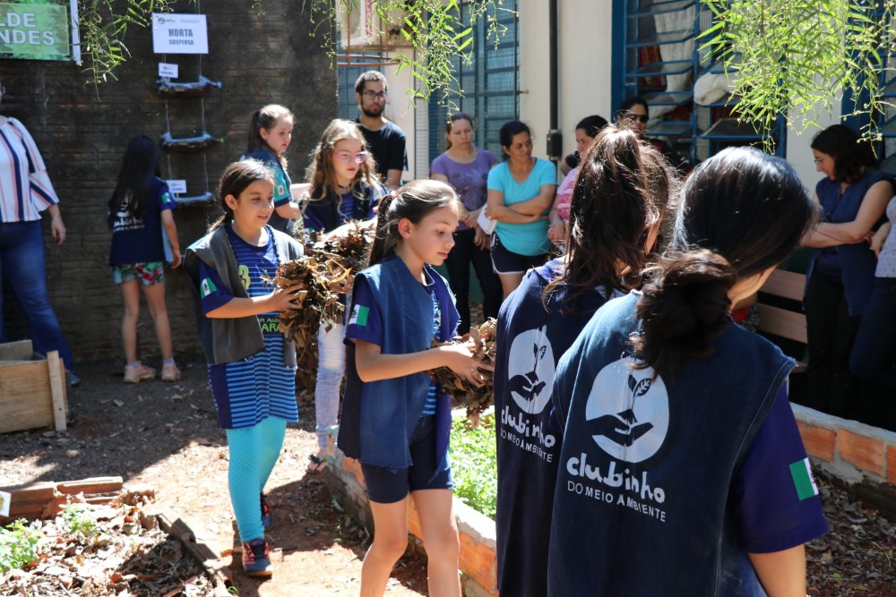 Cada familiar, professor e funcionário trouxeram seus resíduos para a composteira, e o Clubinho do Meio Ambiente orientou o funcionamento do processo de compostagem, bem como todo o percurso de organização da horta da escola. Todos foram convidados a plantar temperos e verduras, e ainda, coletar os alfaces plantados a partir do Método Lages de Compostagem.