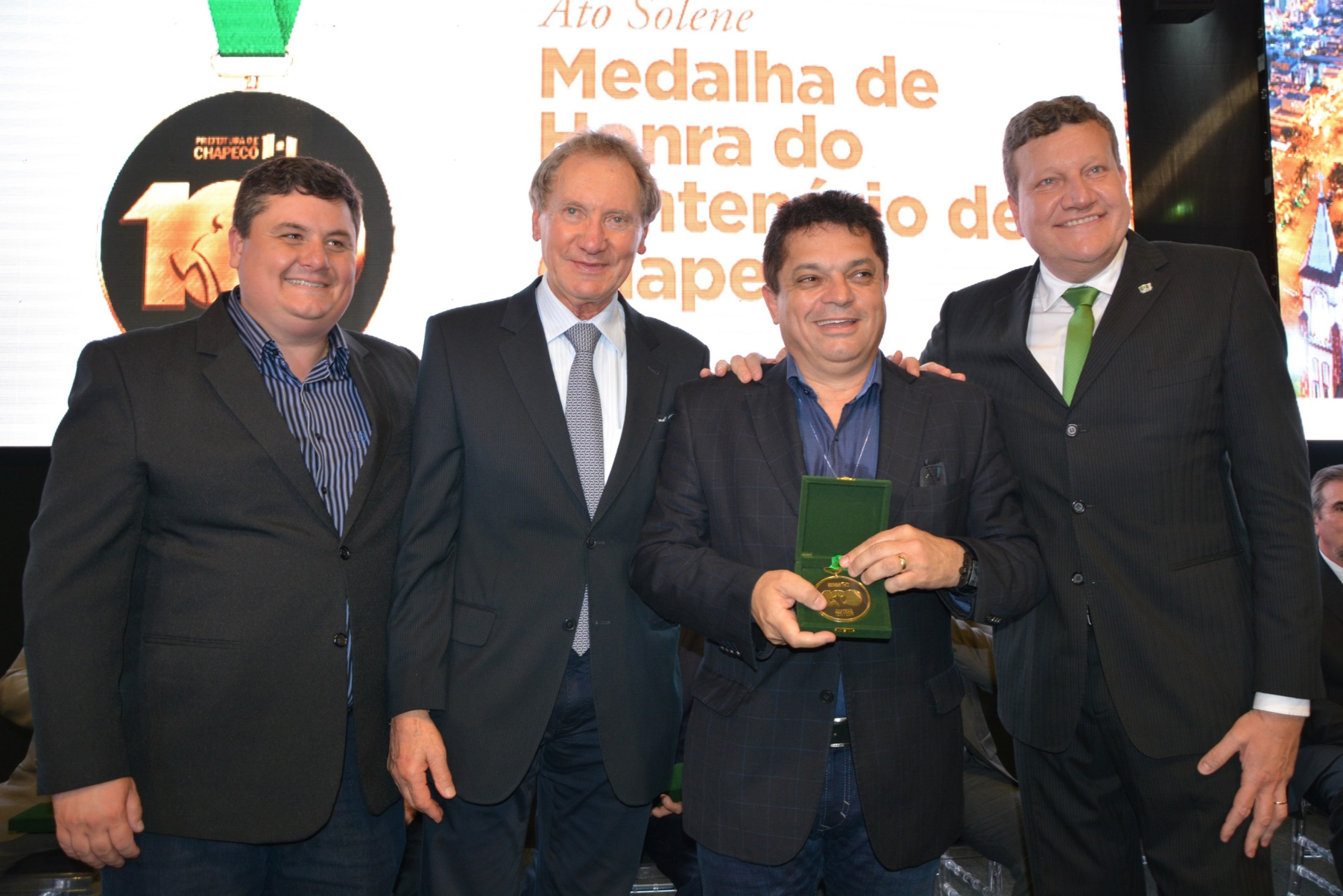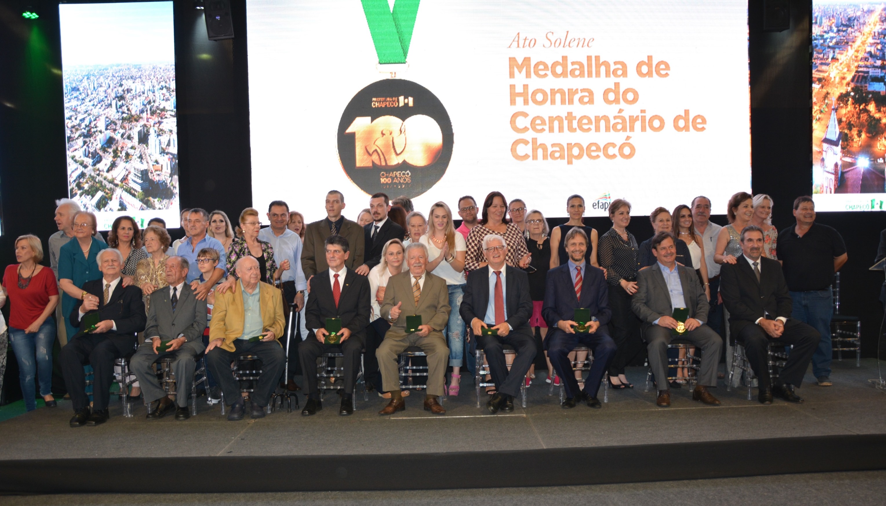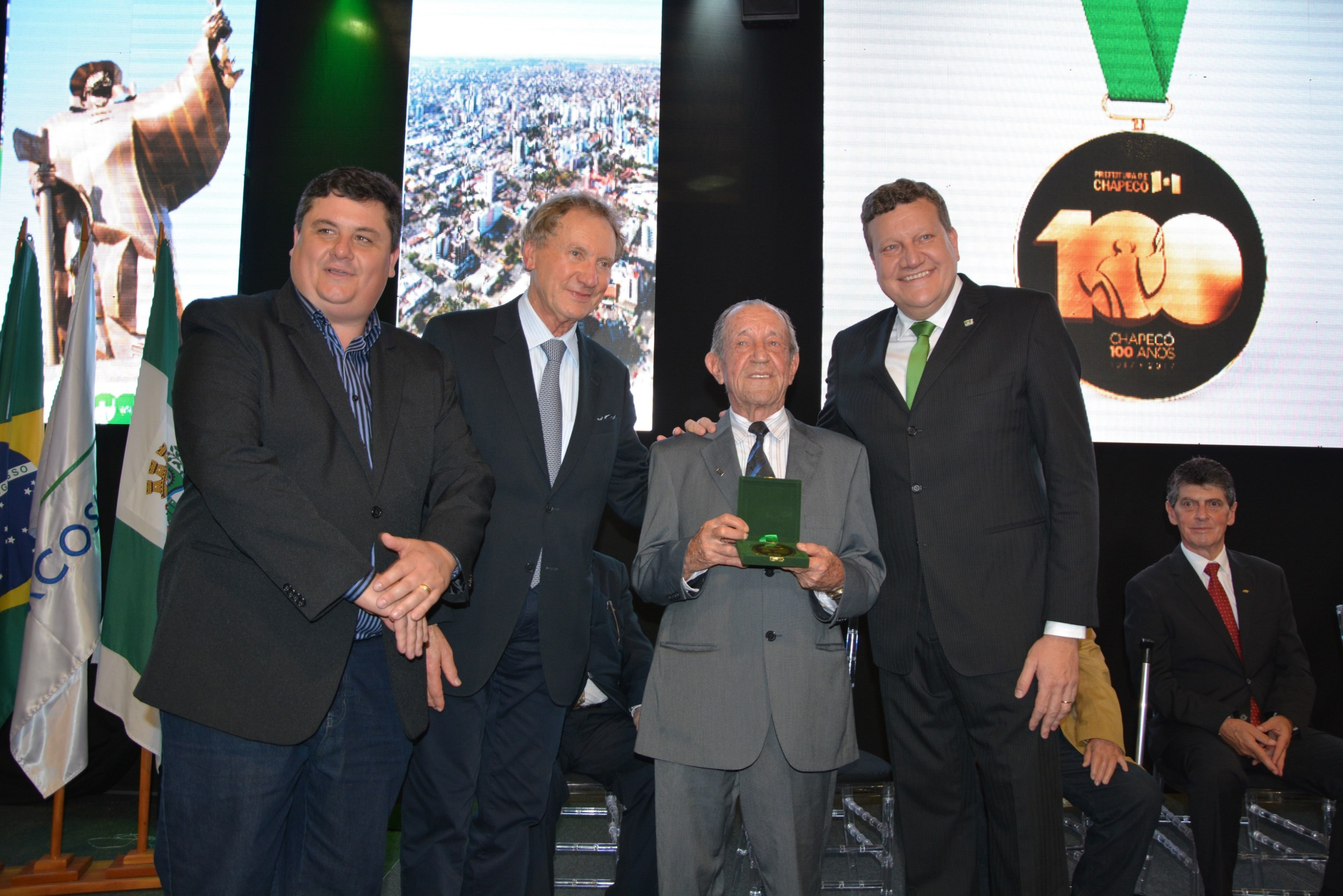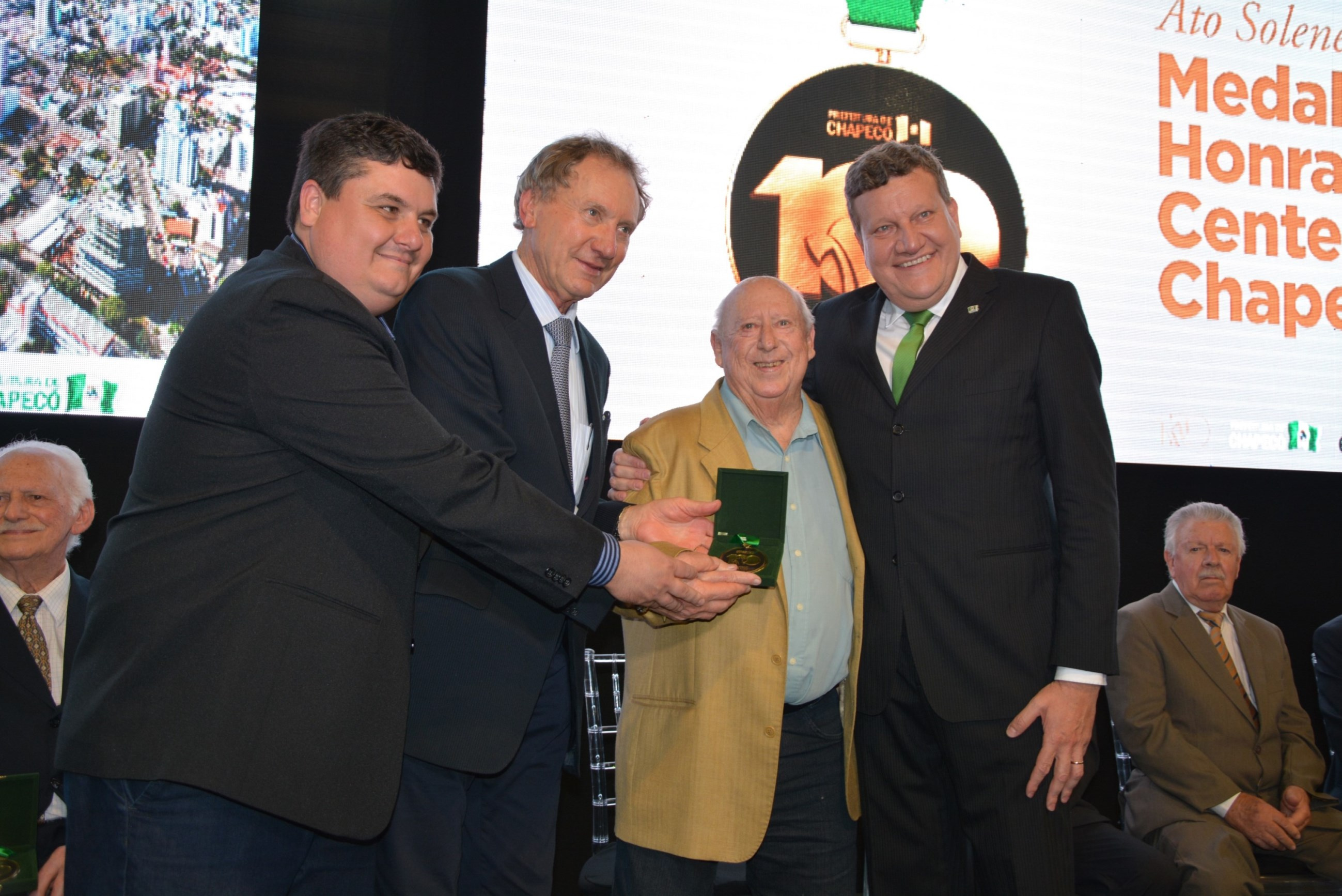 A noite desta quarta-feira (11) foi marcada por homenagens e emoção no Parque de Exposições Tancredo de Almeida Neves. Em uma cerimônia realizada no estande da Prefeitura, ex-prefeitos municipais receberam a Medalha de Honra do centenário de Chapecó. Instituida por meio do decreto nº 34.566, assinado pelo prefeito Luciano Buligon no dia 10 de agosto de 2017, a medalha faz parte das comemorações dos 100 anos e é uma forma de manter viva a memória histórica do município.
