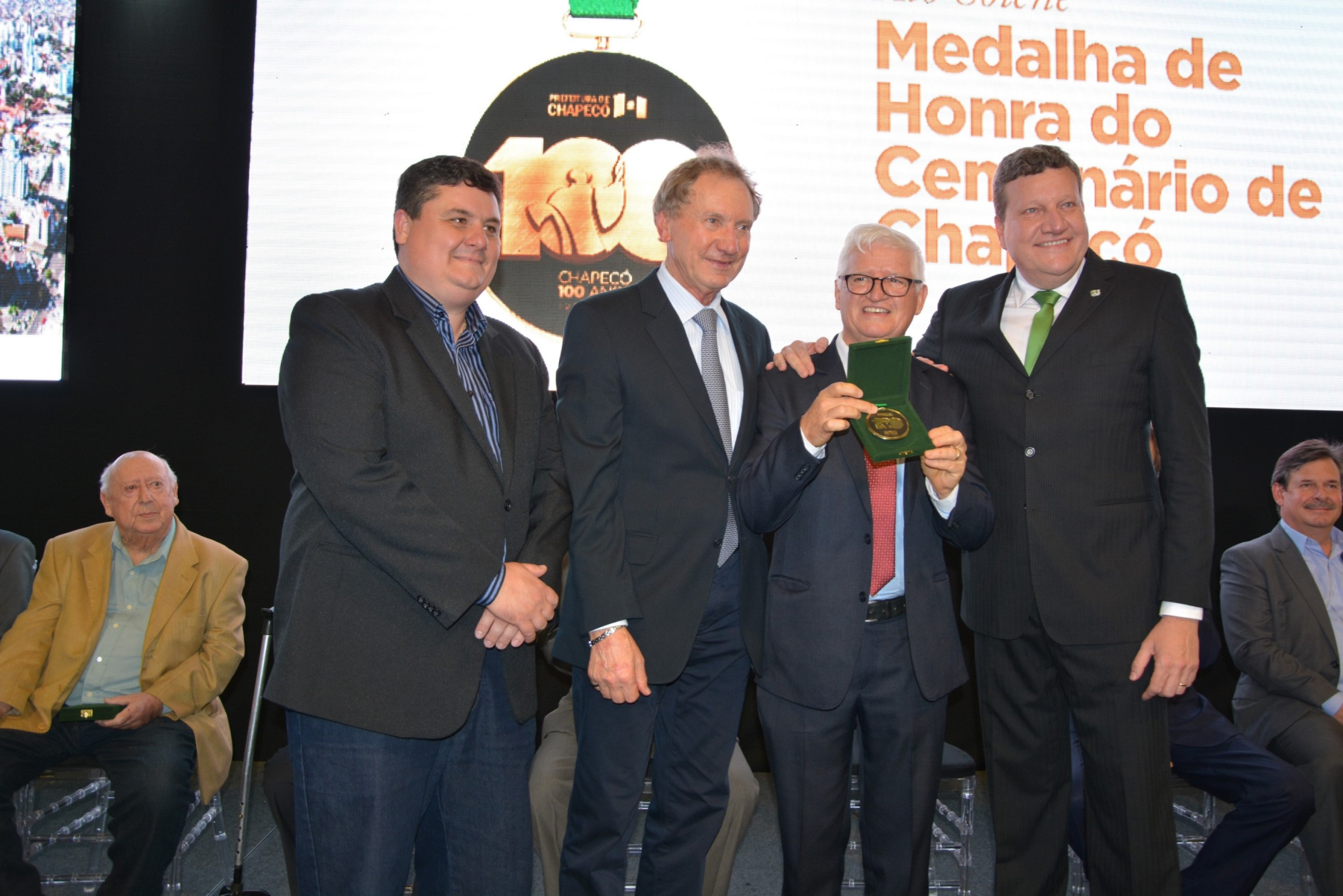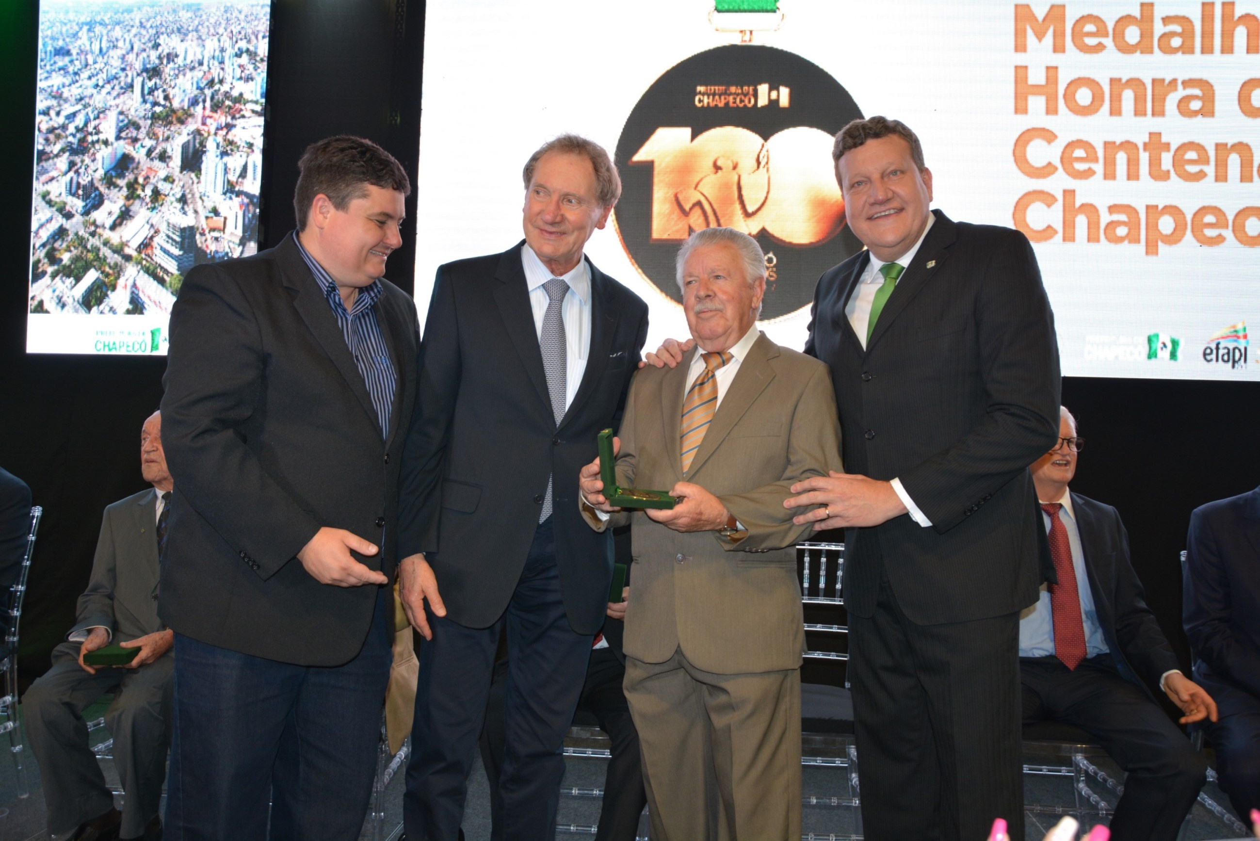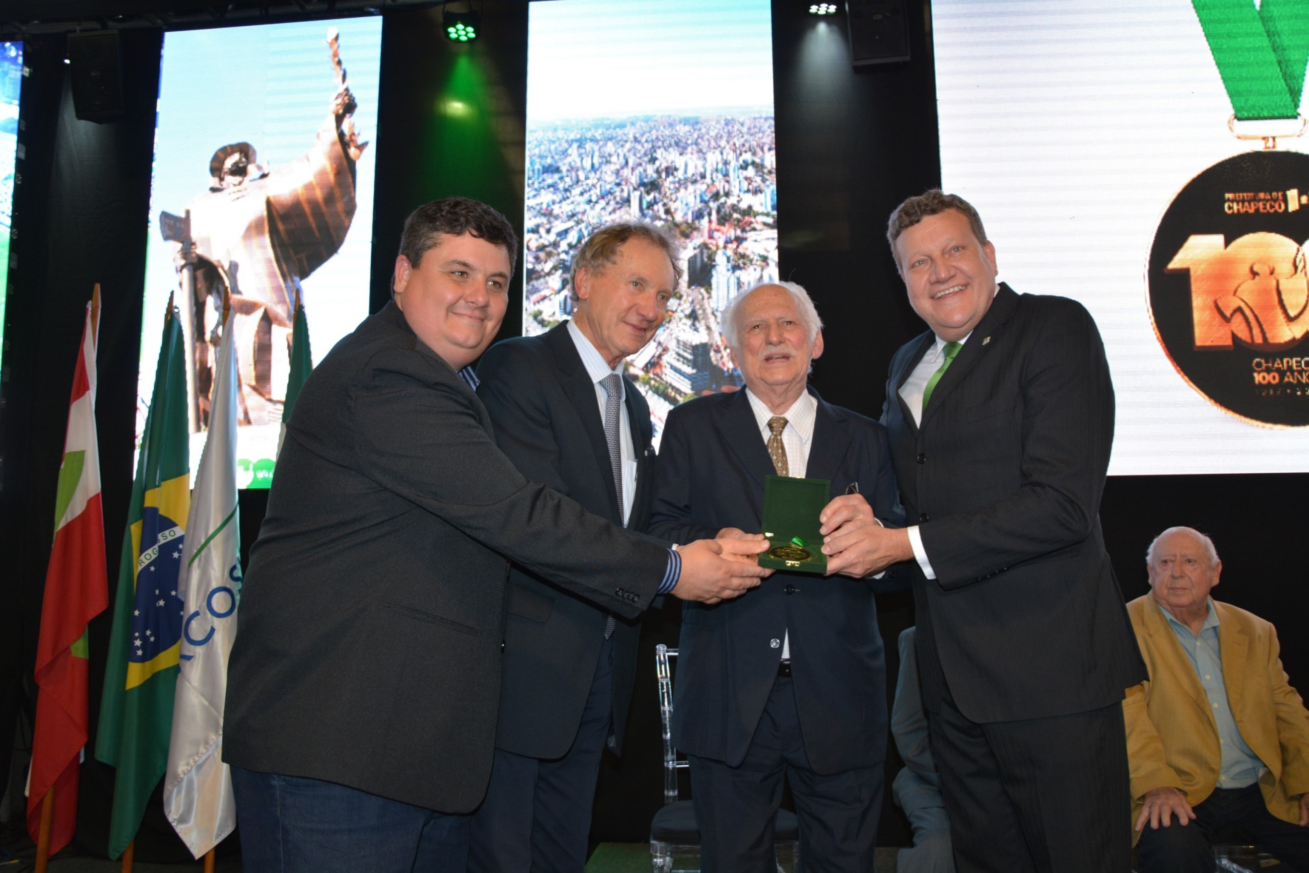 A noite desta quarta-feira (11) foi marcada por homenagens e emoção no Parque de Exposições Tancredo de Almeida Neves. Em uma cerimônia realizada no estande da Prefeitura, ex-prefeitos municipais receberam a Medalha de Honra do centenário de Chapecó. Instituida por meio do decreto nº 34.566, assinado pelo prefeito Luciano Buligon no dia 10 de agosto de 2017, a medalha faz parte das comemorações dos 100 anos e é uma forma de manter viva a memória histórica do município.