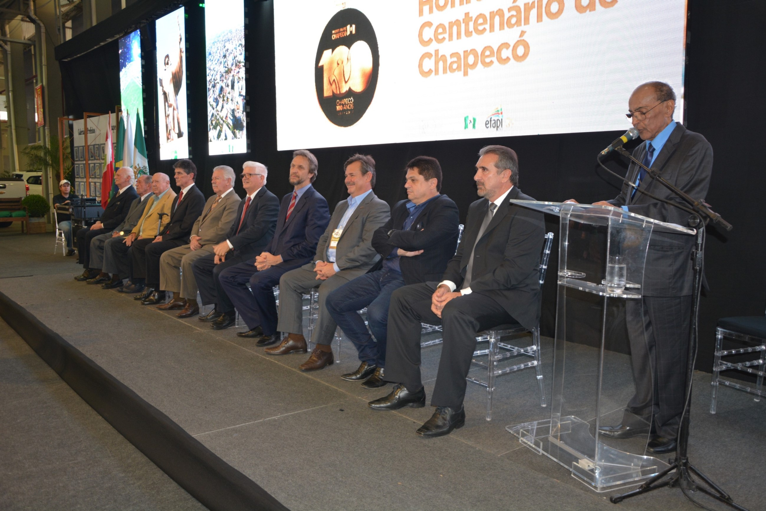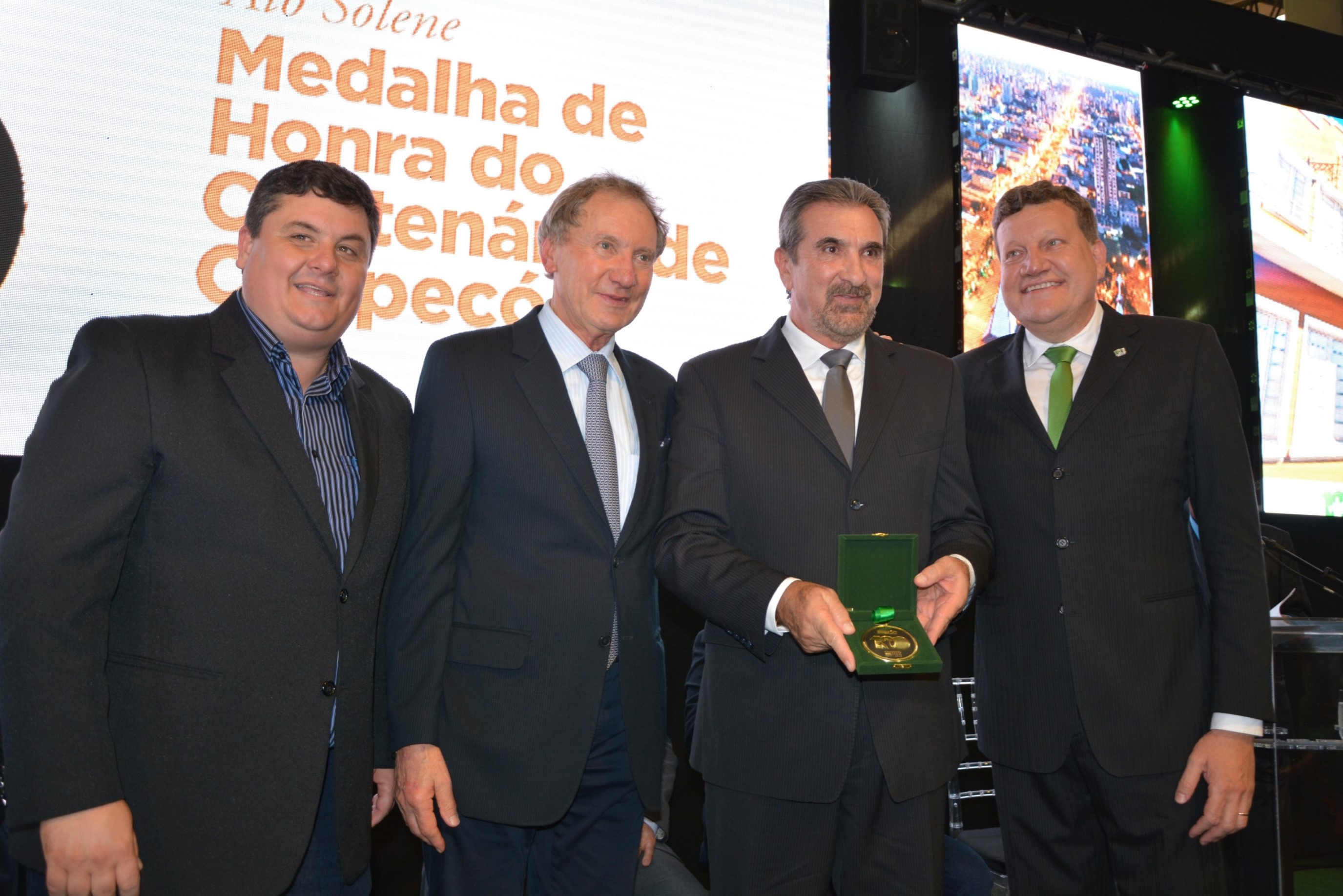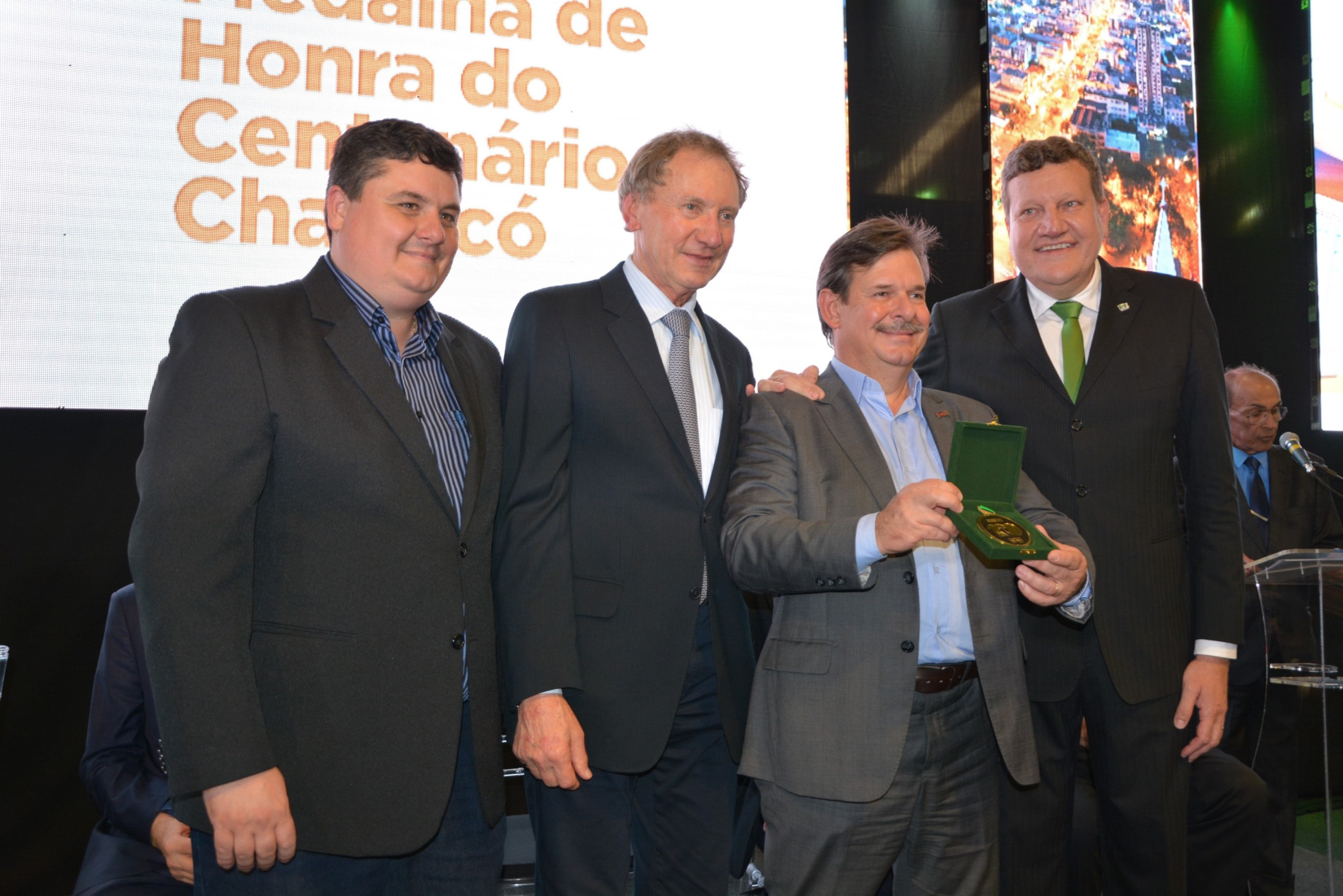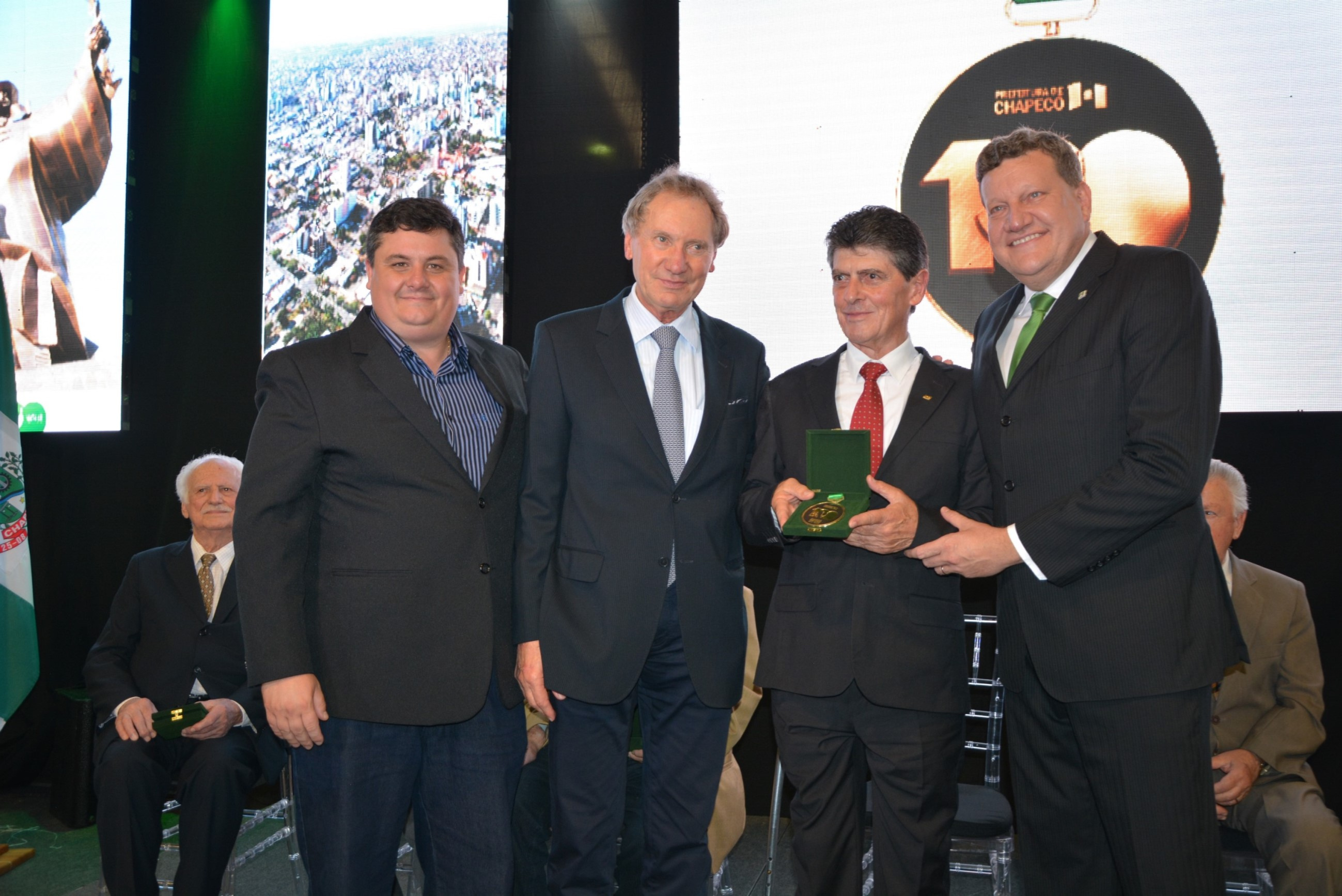 A noite desta quarta-feira (11) foi marcada por homenagens e emoção no Parque de Exposições Tancredo de Almeida Neves. Em uma cerimônia realizada no estande da Prefeitura, ex-prefeitos municipais receberam a Medalha de Honra do centenário de Chapecó. Instituida por meio do decreto nº 34.566, assinado pelo prefeito Luciano Buligon no dia 10 de agosto de 2017, a medalha faz parte das comemorações dos 100 anos e é uma forma de manter viva a memória histórica do município.