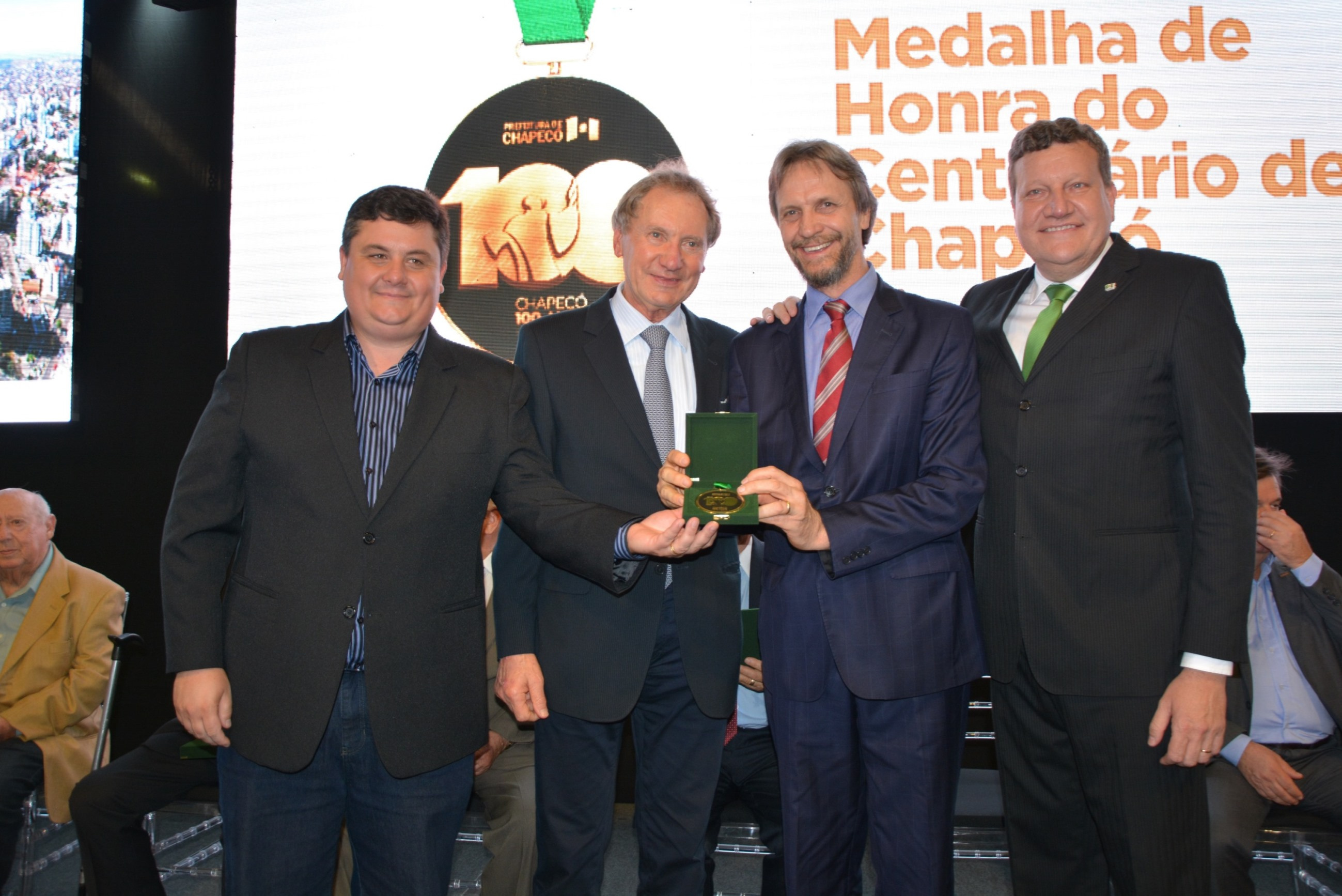 As homenagens foram entregues pelo prefeito, o presidente da Câmara de Vereadores, Valmor Junior Scolari e o ex-senador Casildo Maldaner. A medalha foi confeccionada especialmente para a ocasião e tem gravado o selo do centenário.