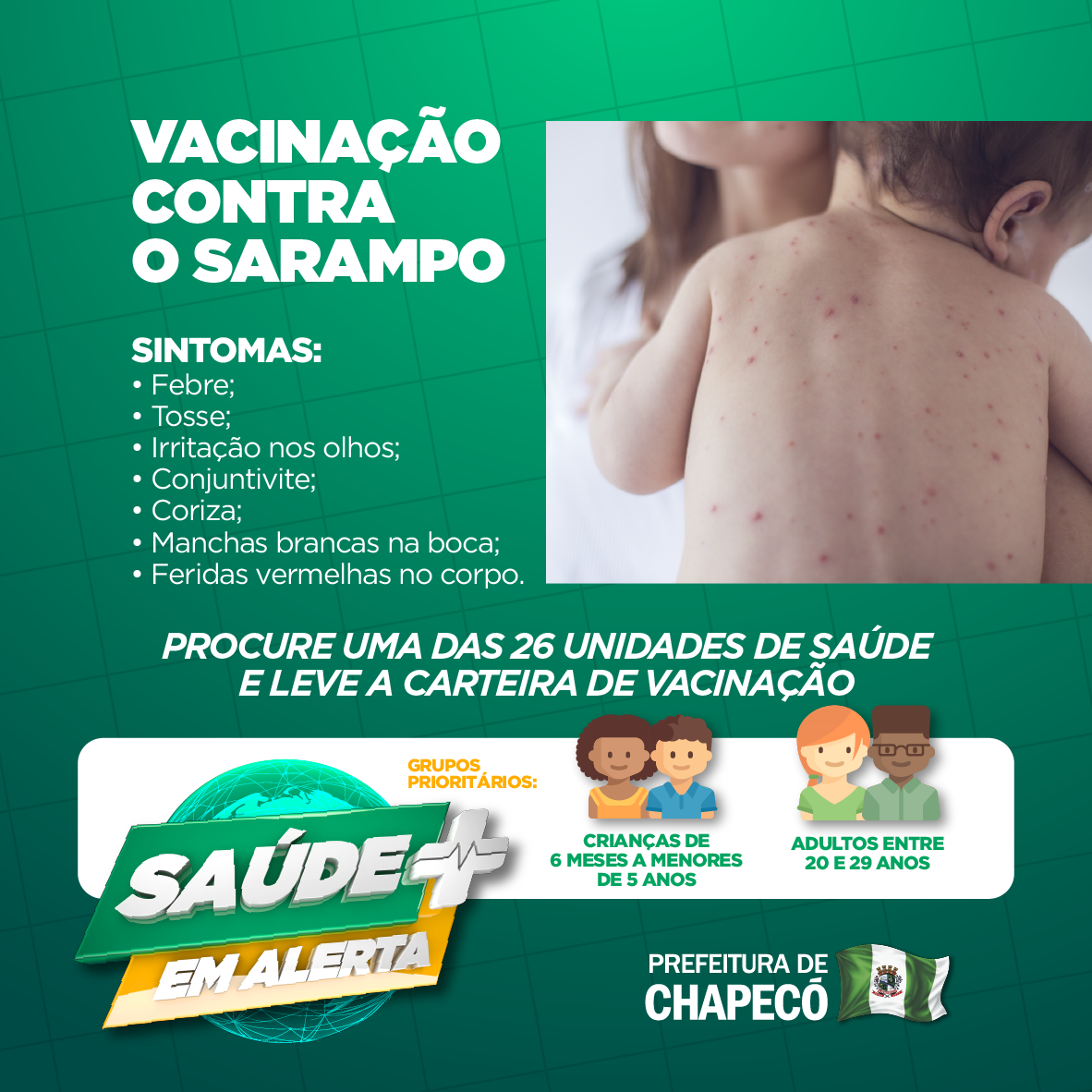 Chapecó, 01/11/2019, sexta-feira O sarampo é uma doença infecciosa exantemática aguda, transmissível e extremamente contagiosa, muito comum na infância, podendo evoluir para complicações e óbito. A transmissão ocorre de pessoa a pessoa, por meio de secreções respiratórias, no período de quatro a seis dias antes do aparecimento do exantema até quatro dias após. Os sintomas são: febre maior que 38,5 °C, tosse e coriza, conjuntivite, dor de cabeça, manchas brancas na boca e manchas vermelhas pelo corpo (exantema) sem prurido.