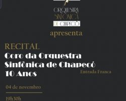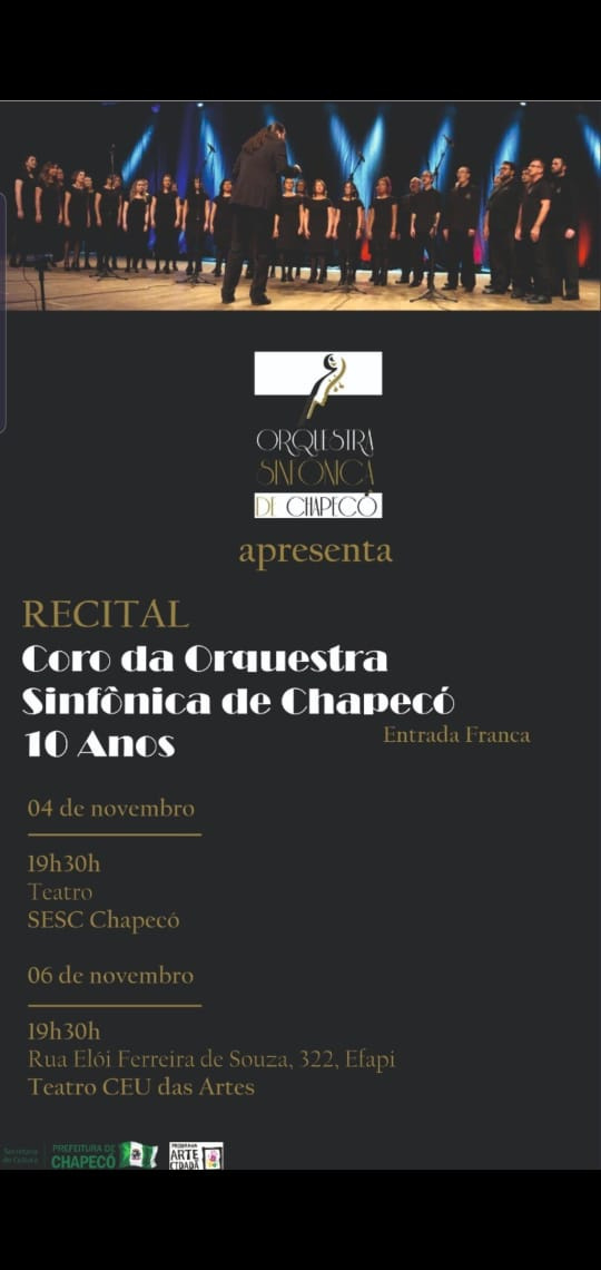 - Dia 06 de Novembro, 19h30, Teatro CEU das Artes: Recital de 10 anos do Coro da Orquestra Sinfônica de Chapecó.