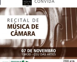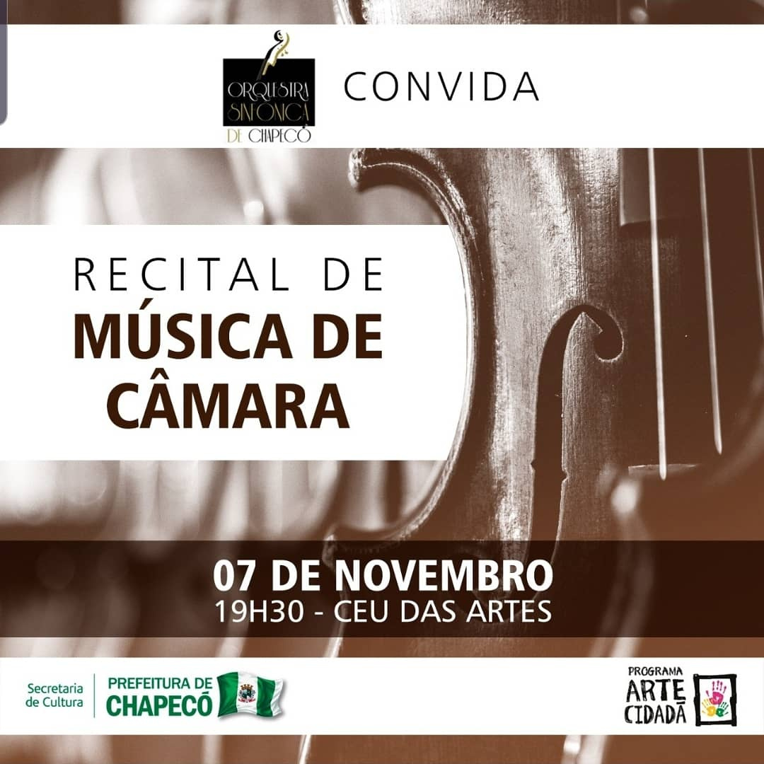 - Dia 07 de Novembro, 19h30, Teatro CEU das Artes: 4º Recital de Música de Câmara da Orquestra Sinfônica de Chapecó Aaosc Orquestra Sinfônica Chapecó.