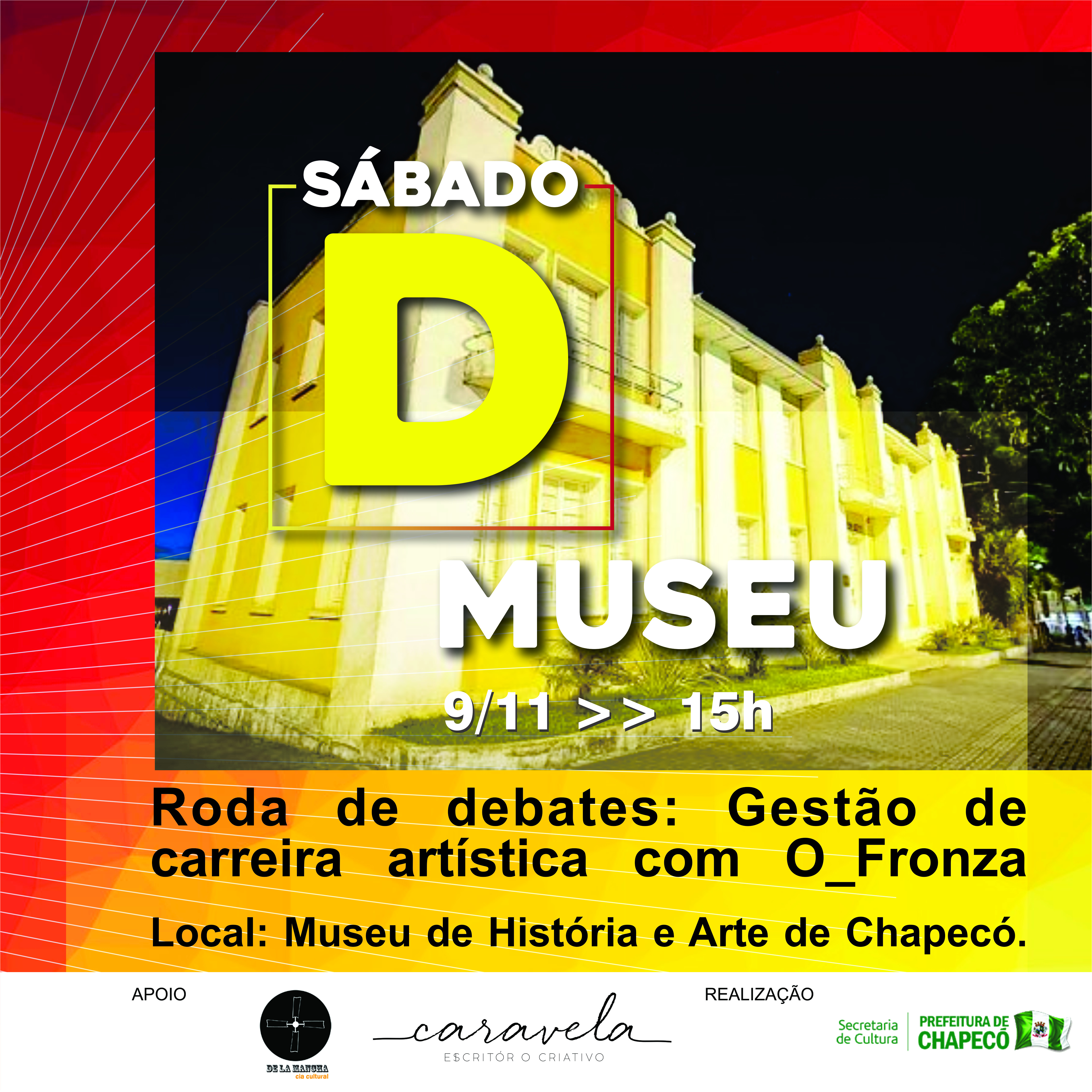 Chapecó, 04/11/2019, segunda-feira No sábado (09/11), às 15 horas, acontecerá mais uma edição do Projeto Sábado D Museu. Nesta 11ª edição do Sábado D Museu, o Museu de História e Arte de Chapecó - MHAC realiza uma roda de debates: Gestão de carreira artística com O_Fronza. Será uma roda de debates direcionada para o meio cultural e artistas regionais sobre processos de gestão de carreiras artísticas e os enfrentamentos da classe com o meio empresariado e as instituições públicas.