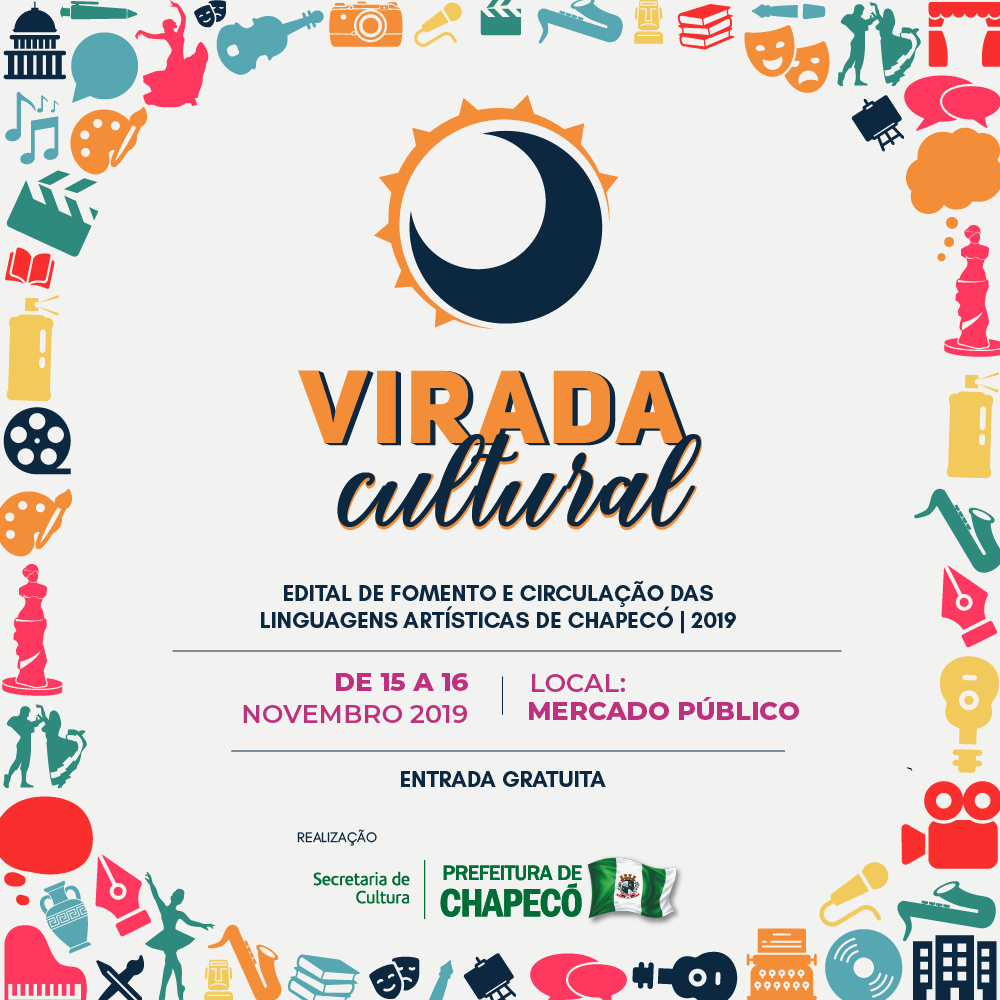 A Virada Cultural foi idealizada a partir dos projetos selecionados pelo Edital de Fomento e Circulação das Linguagens Artísticas de Chapecó, promovido pela Administração Municipal, por meio da Secretaria de Cultura e propõe a mostra de todos os trabalhos contemplados em 2019. Na Virada Cultural os chapecoenses e visitantes poderão apreciar manifestações artísticas como: shows musicais, espetáculos de teatro e dança, contação de histórias, exposição de artes visuais, lançamento de livros, palestras e oficinas, exibição de filmes, e outros projetos realizados pelos artistas e produtores culturais de Chapecó. A ideia surgiu na audiência promovida pela Secretaria de Cultura com os segmentos artísticos por ocasião da apresentação da proposta do Edital de Fomento e Circulação das Linguagens Artísticas de Chapecó 2019, que neste ano contemplou 39 projetos, os quais farão parte do evento.