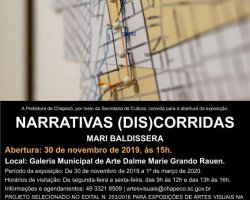 Chapecó, 25/11/2019, segunda-feira A Exposição Narrativas (dis)corridas da Artista Visual Mari Baldissera inicia no sábado (30), às 15 horas, em Chapecó na Galeria Municipal de Arte Dalme Marie Grando Rauen, Praça Coronel. A exposição de Artes Visuais, com temática contemporânea, foi selecionada via Edital de Seleção.