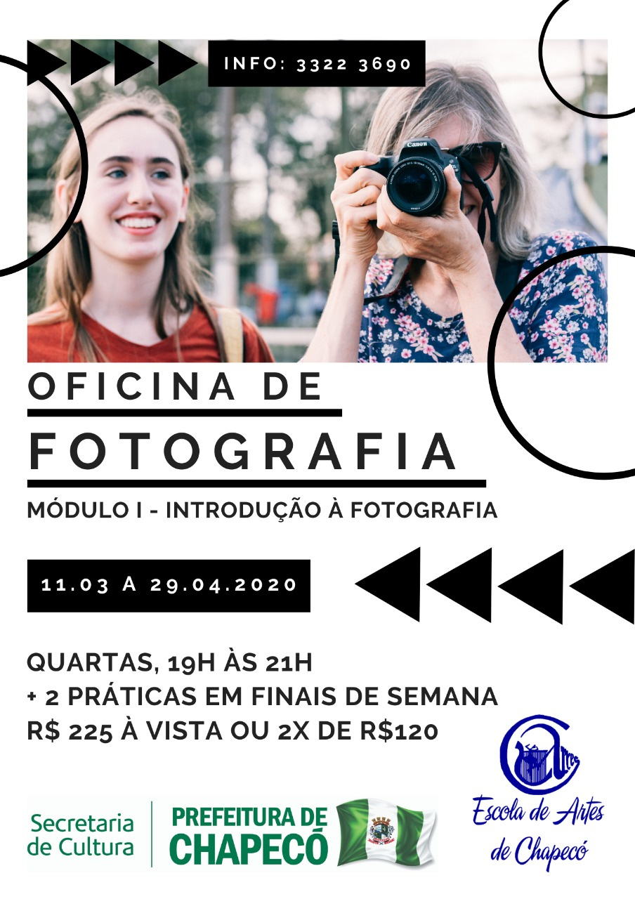 Chapecó, 12/02/2020, quarta-feira Estão abertas as matrículas para o Módulo I da Oficina de Fotografia Introdução a Fotografia, realizada pela Escola de Artes de Chapecó. A professora do curso será Mari Baldissera, da Madeleine Photographie. O valor do curso é de R$ 225,00 à vista ou em duas vezes de R$ 120,00.