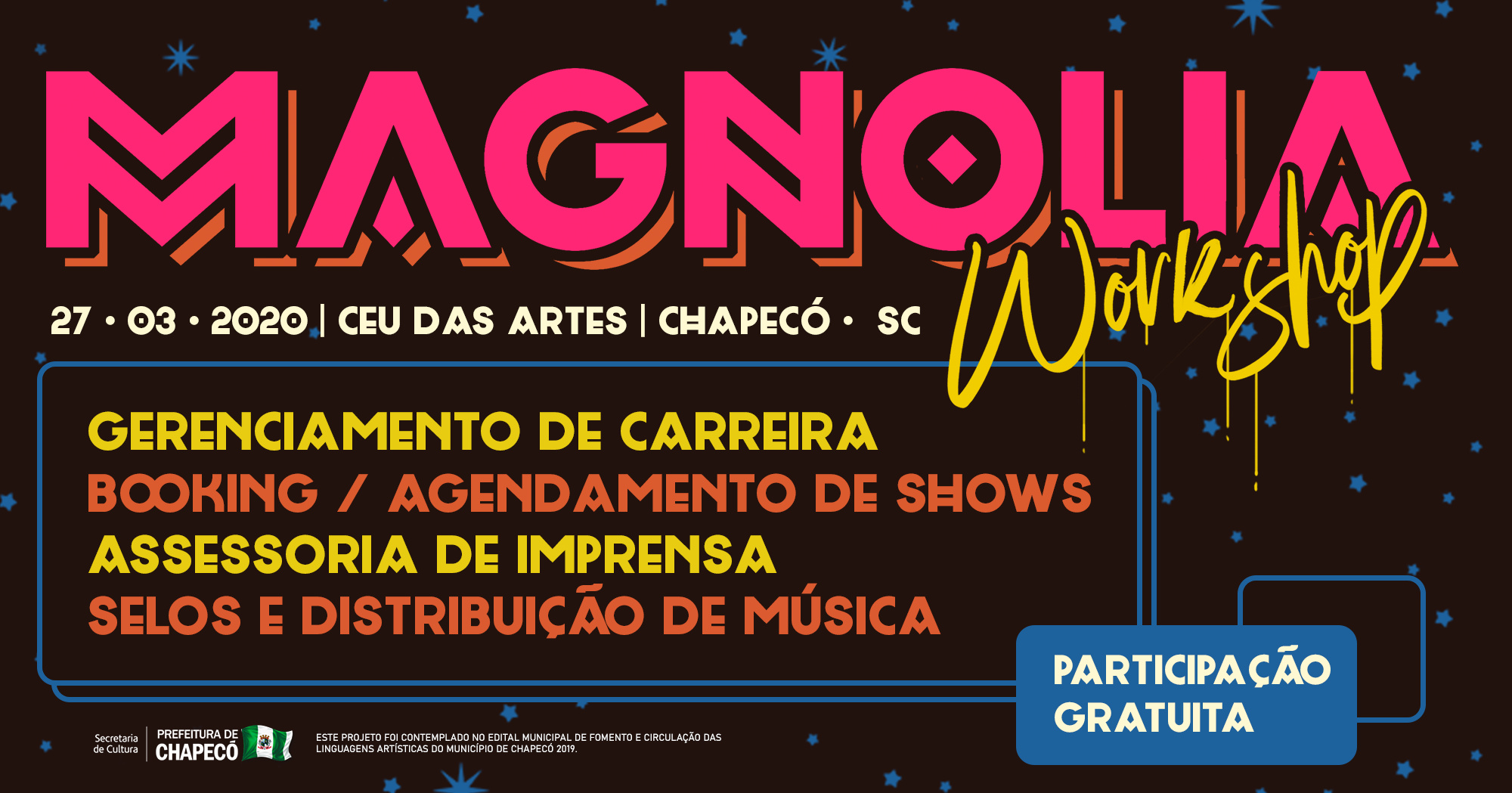 Chapecó, 14/02/2020, sexta-feira Estão abertas as inscrições para workshop gratuito sobre Gestão de Carreira Musical. A capacitação integra a programação oficial do Magnólia Festival 2020 e as vagas são limitadas. Podem inscrever-se músicos, produtores culturais e interessados na área. Para participar basta efetivar a inscrição diretamente no site www.magnoliafestival.com.br/inscricoes . O workshop traz como objetivo central incentivar a capacitação de profissionais, estimulando a construção do conhecimento e oportunizando que a formação aconteça de maneira descentralizada, no interior do estado. A ação que é gratuita, democratiza o acesso ao conhecimento, gera movimento cultural e reflete diretamente na qualidade dos trabalhos desenvolvidos na área.