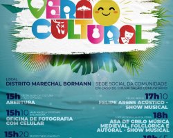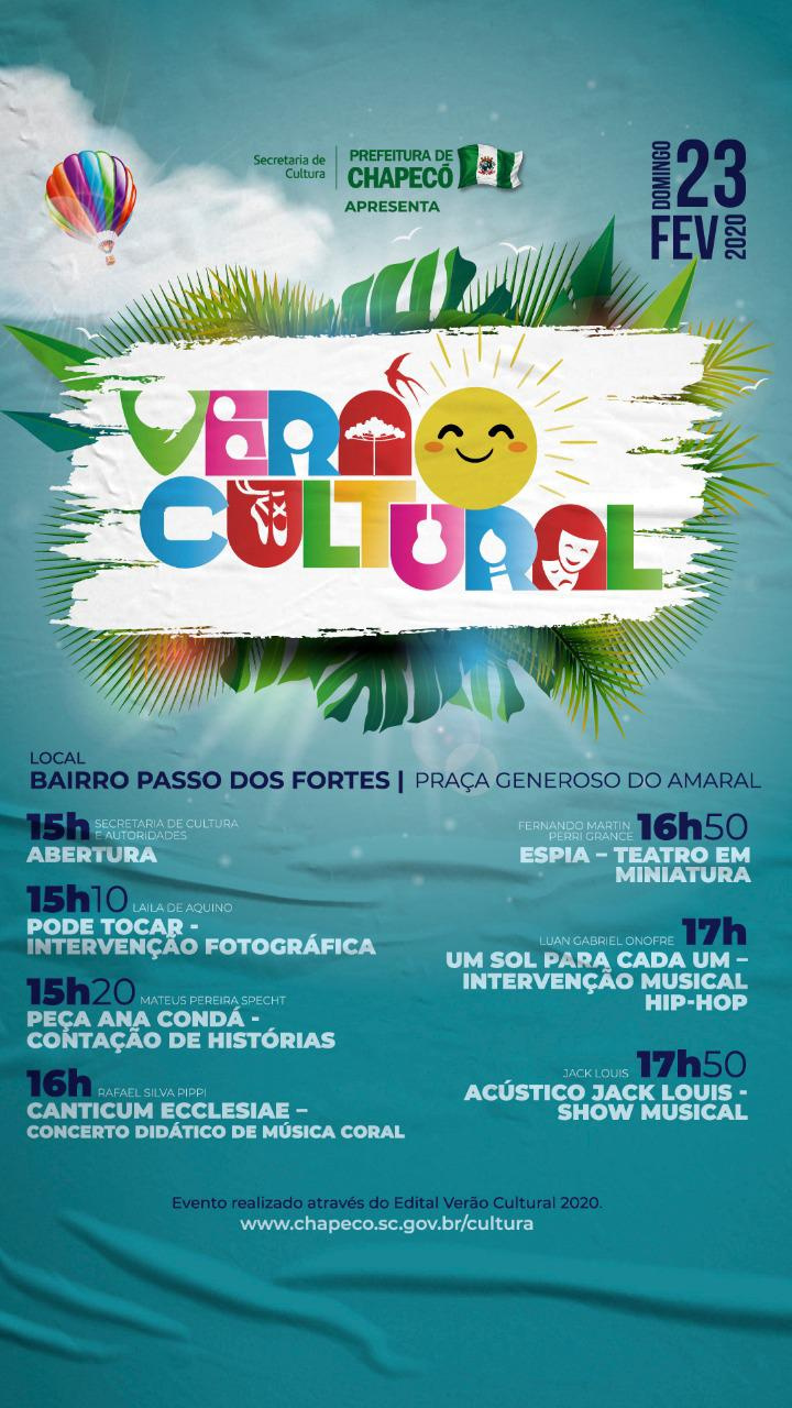 Chapecó, 19/02/2020, quarta-feira A programação do Verão Cultural 2020 neste final de semana (23 e 23/02) chegará às comunidades do Distrito de Marechal Bormann e ao bairro Passo dos Fortes. O projeto Verão Cultural é uma iniciativa da Administração Municipal, por meio da Secretaria de Cultura, que através de Edital, promove a seleção de apresentações artístico-culturais que são levadas para diferentes localidades do município. É um evento multicultural que acontece em espaços abertos como praças e parques, e que este ano chega também às comunidades rurais, mantendo o objetivo de oportunizar o acesso aos bens culturais, através da descentralização de ações, além de valorizar a produção artística local.