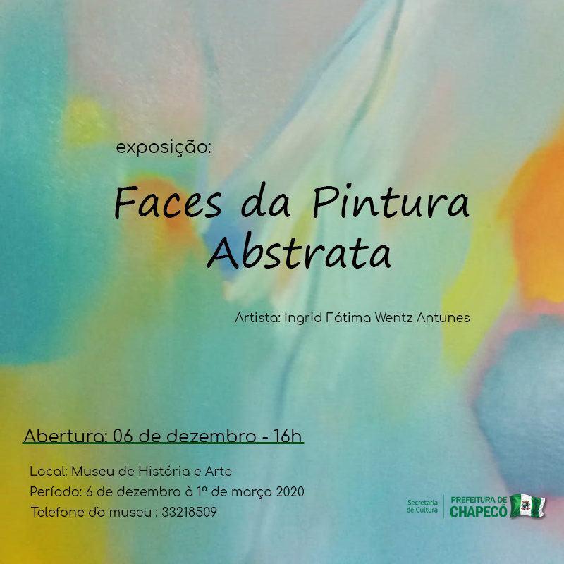 A exposição Faces da pintura abstrata é uma exposição individual da artista Ingrid Fátima Wentz Antunes. A artista, que em suas exposições anteriores priorizou a fotografia, neste momento apresenta uma série de pinturas abstratas, que se manifestam numa experiência pictórica rica em cores, formas e linhas, impressas em telas com tinta à óleo, resultando numa incursão pela linguagem contemporânea da arte. A exposição pretende oferecer ao visitante a oportunidade de uma experiência artística em artes visuais, por meio da fruição de obras da produção artística contemporânea de Chapecó.