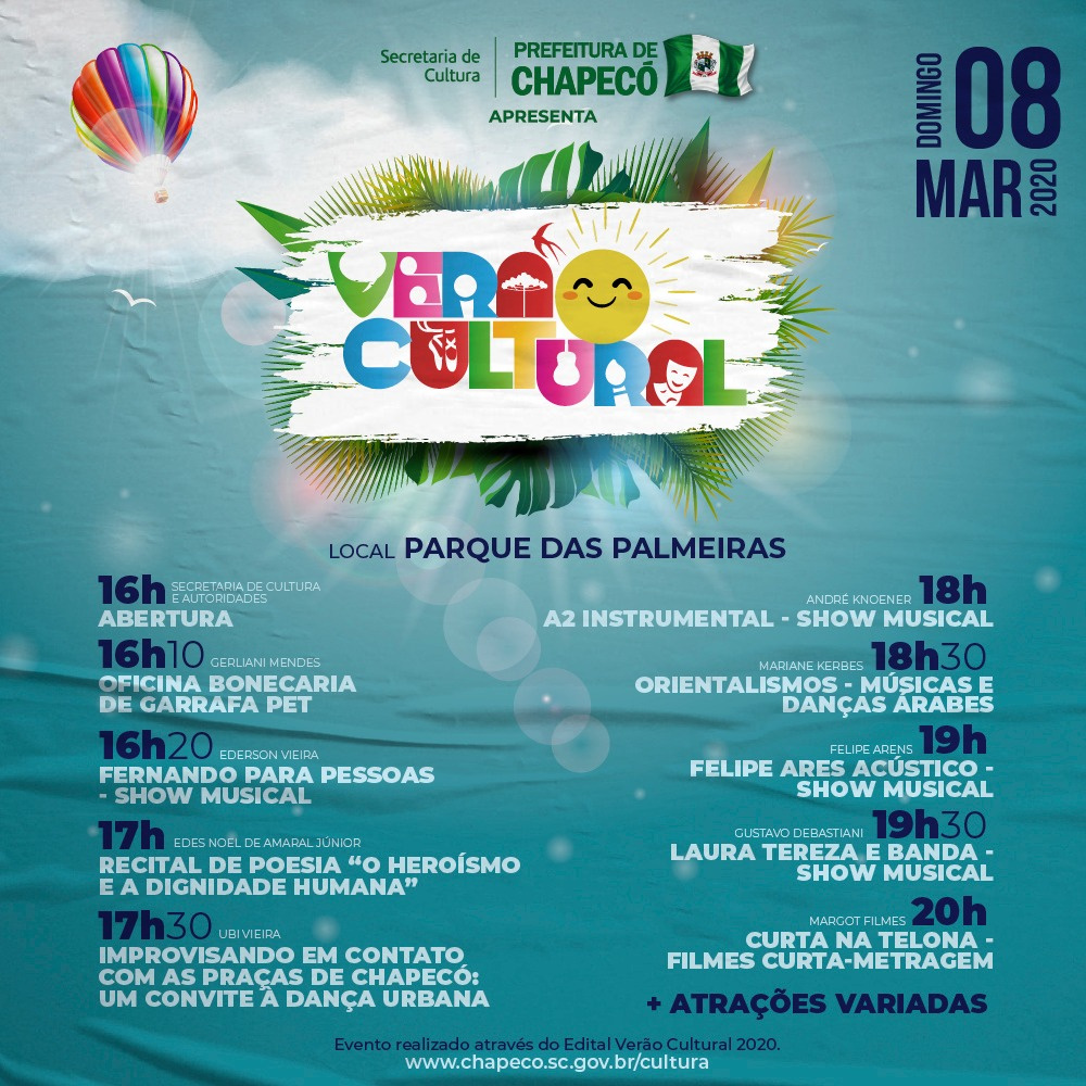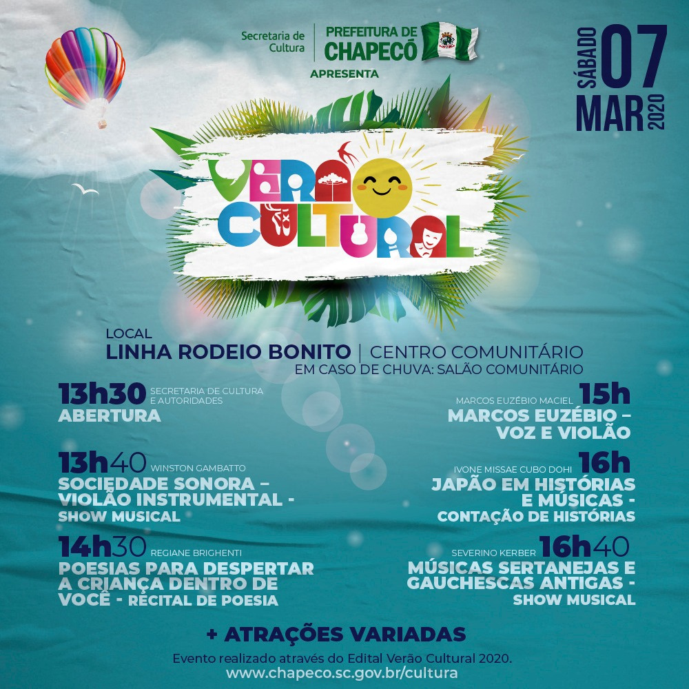 Chapecó, 04/03/2020, quarta-feira A programação do Verão Cultural 2020 neste final de semana (07 e 08/03) será realizado na Linha Rodeio Bonito e no Parque das Palmeiras. O projeto Verão Cultural é uma iniciativa da Administração Municipal, por meio da Secretaria de Cultura, que através de Edital, promove a seleção de apresentações artístico-culturais que são levadas para diferentes localidades do município. É um evento multicultural que acontece em espaços abertos como praças e parques, e que este ano chega também às comunidades rurais, mantendo o objetivo de oportunizar o acesso aos bens culturais, através da descentralização de ações, além de valorizar a produção artística local.