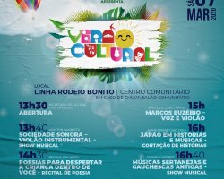 No sábado (07) a atividade acontecerá a partir das 13h30 na Linha Rodeio Bonito. Já no domingo (08) a atividade acontecerá no Parque das Palmeiras. Durante as atividades do Verão Cultural, serão realizadas apresentações culturais gratuitas de artistas, espalhadas por praças e parques de diferentes localidades. A iniciativa visa oportunizar e democratizar o acesso à arte e à cultura, descentralizar as atividades culturais levando-as também para os bairros e interior, com o objetivo de difundir a produção cultural local, fazendo com que as pessoas conheçam o trabalho dos artistas da comunidade.