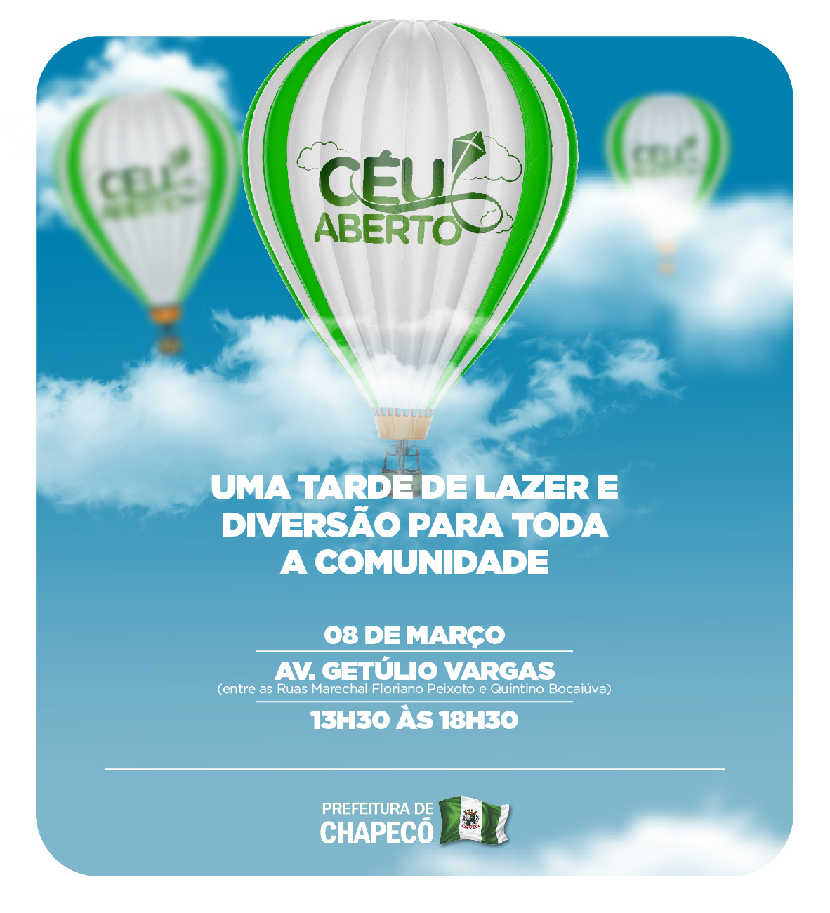 Chapecó, 05/03/2020 - quinta-feira Muita diversão e alegria é o que promete a segunda edição do Céu Aberto que acontece neste domingo (08) em Chapecó. Desta vez o Programa acontece na Avenida Getúlio Vargas, entre as ruas Marechal Floriano Peixoto e Quintino Bocaiúva. A via estará fechada para o tráfego de veículos e poderá ser utilizada pela comunidade das 13h30 às 18h30.