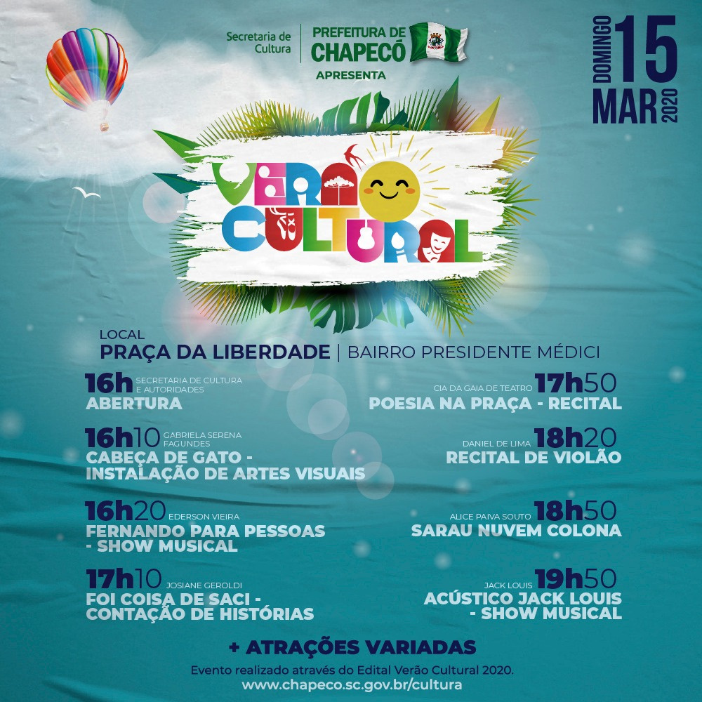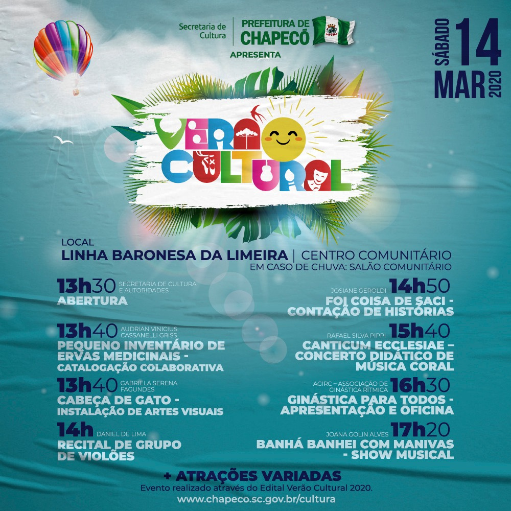Chapecó, 11/03/2020, quarta-feira A programação do Verão Cultural 2020 neste final de semana (14 e 15/03) será realizada na Linha Baronesa da Limeira e na Praça da Liberdade no bairro Presidente Médici. O projeto Verão Cultural é uma iniciativa da Administração Municipal, por meio da Secretaria de Cultura, que através de Edital, promove a seleção de apresentações artístico-culturais que são levadas para diferentes localidades do município. É um evento multicultural que acontece em espaços abertos como praças e parques, e que este ano chega também às comunidades rurais, mantendo o objetivo de oportunizar o acesso aos bens culturais, através da descentralização de ações, além de valorizar a produção artística local.