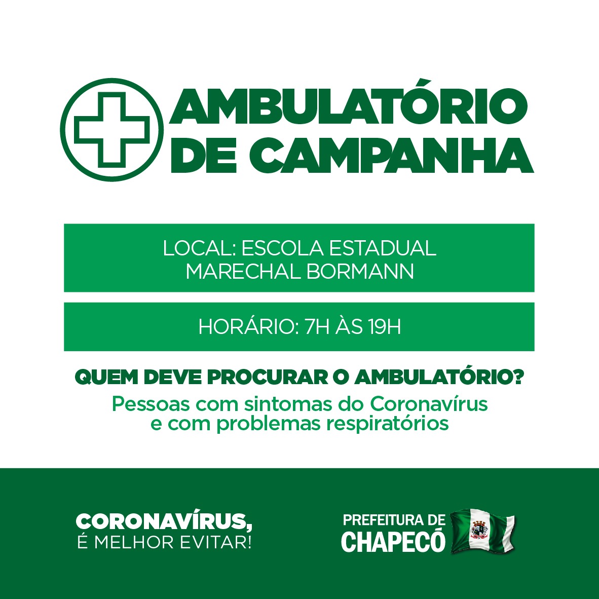 Chapecó, 22/03/2020, domingo O Ambulatório de Campanha inicia nesta segunda-feira (23/03) em Chapecó. Será um espaço provisório criado para atender neste momento de enfrentamento ao Coronavírus, destinado aos pacientes com sintomas e que apresentem problemas respiratórios. O espaço terá atendimento médico e de enfermagem com avaliações dos profissionais de saúde, consultórios, equipamentos e dispensação de medicamentos. Atenderá crianças e adultos, das 07 às 19 horas.