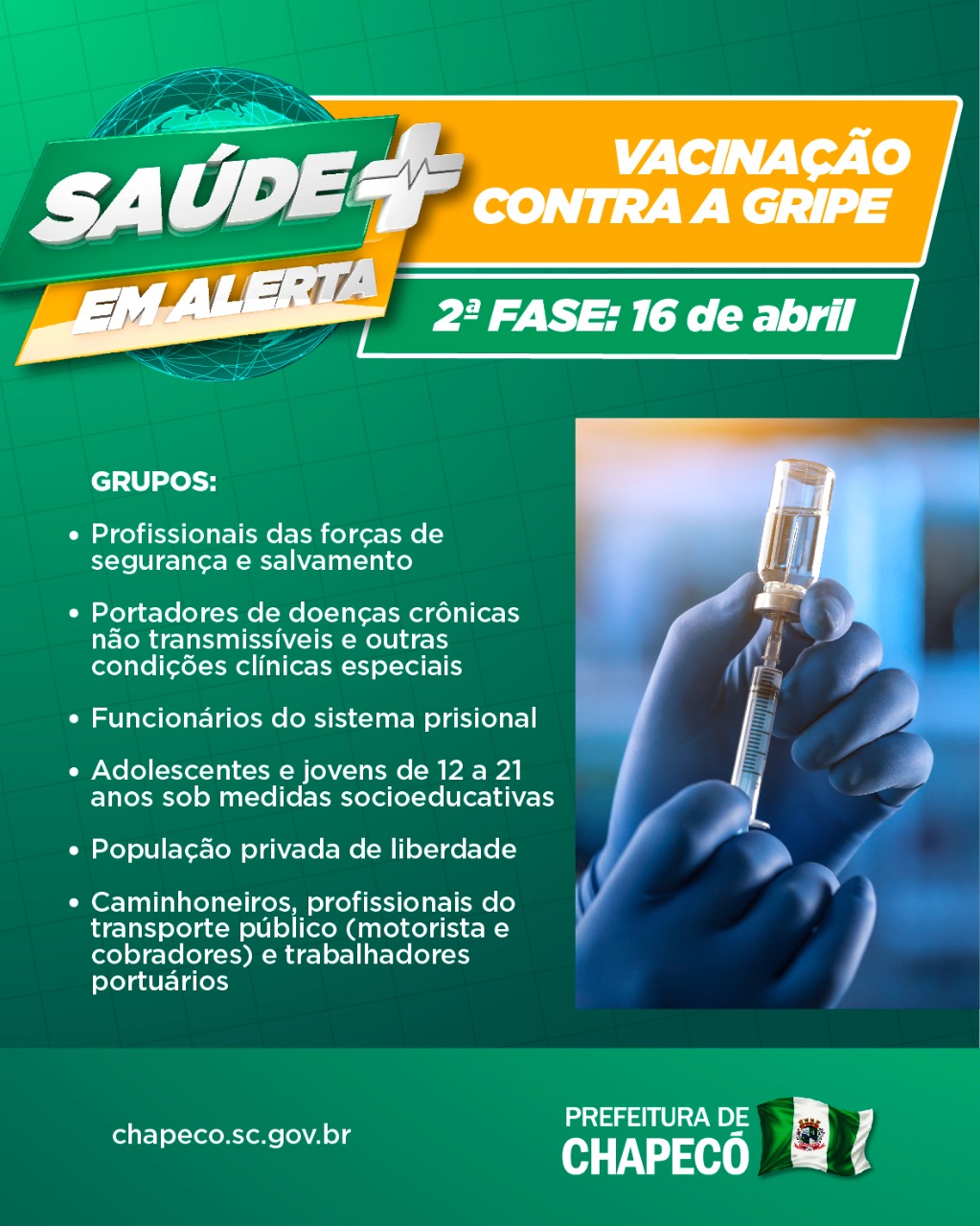 Chapecó, 16/04/2020, quinta-feira Chapecó está recebendo nesta quinta-feira (16) novas 9.500 doses de vacina. O município já havia recebido 22.940 doses nos primeiros dias da Campanha Nacional de Vacinação contra a Influenza. A orientação ao cidadão é que faça contato com a sua Unidade de Saúde, no seu bairro, se as doses já estão disponíveis, pois o reabastecimento ocorrerá durante esta quinta-feira, no máxima sexta-feira pela manhã.