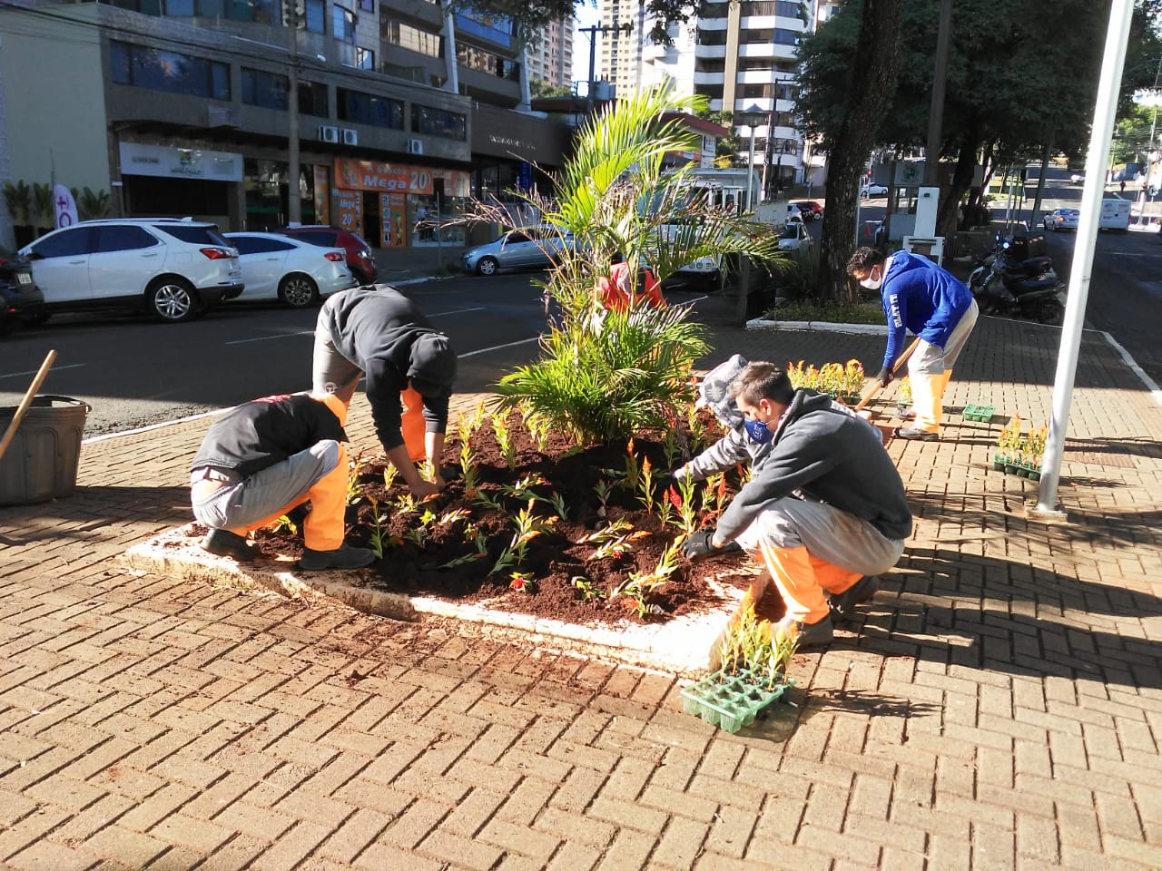 - Ajardinamento, plantio de grama e flores nos canteiros e rótulas localizadas na Avenida Getúlio Vargas e Terminal Interestadual de Passageiros.