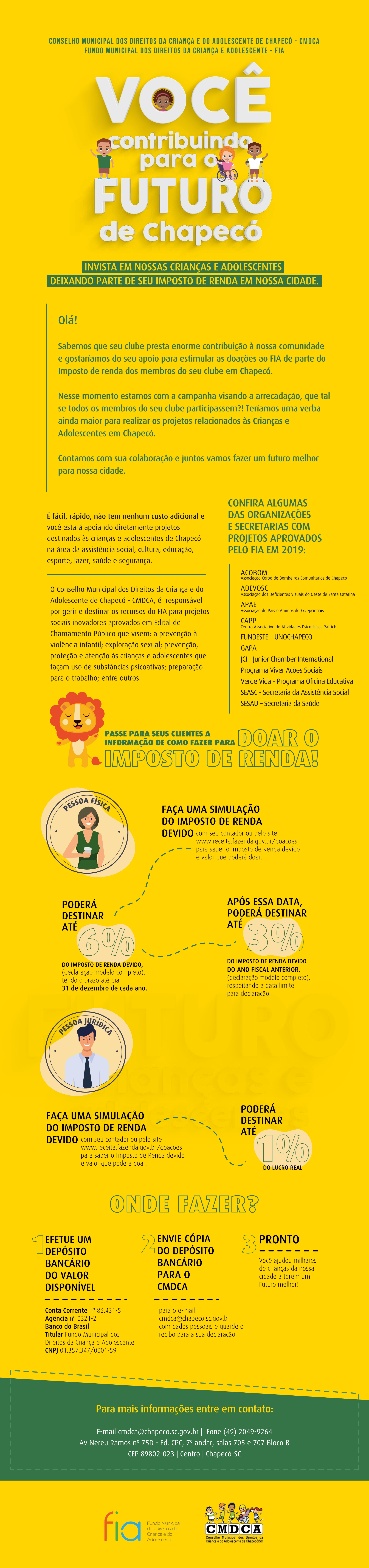 O Conselho Municipal dos Direitos da Criança e do Adolescente de Chapecó (CMDCA) promove uma campanha para estimular doações ao Fundo Municipal dos Direitos da Criança e do Adolescente (FIA).