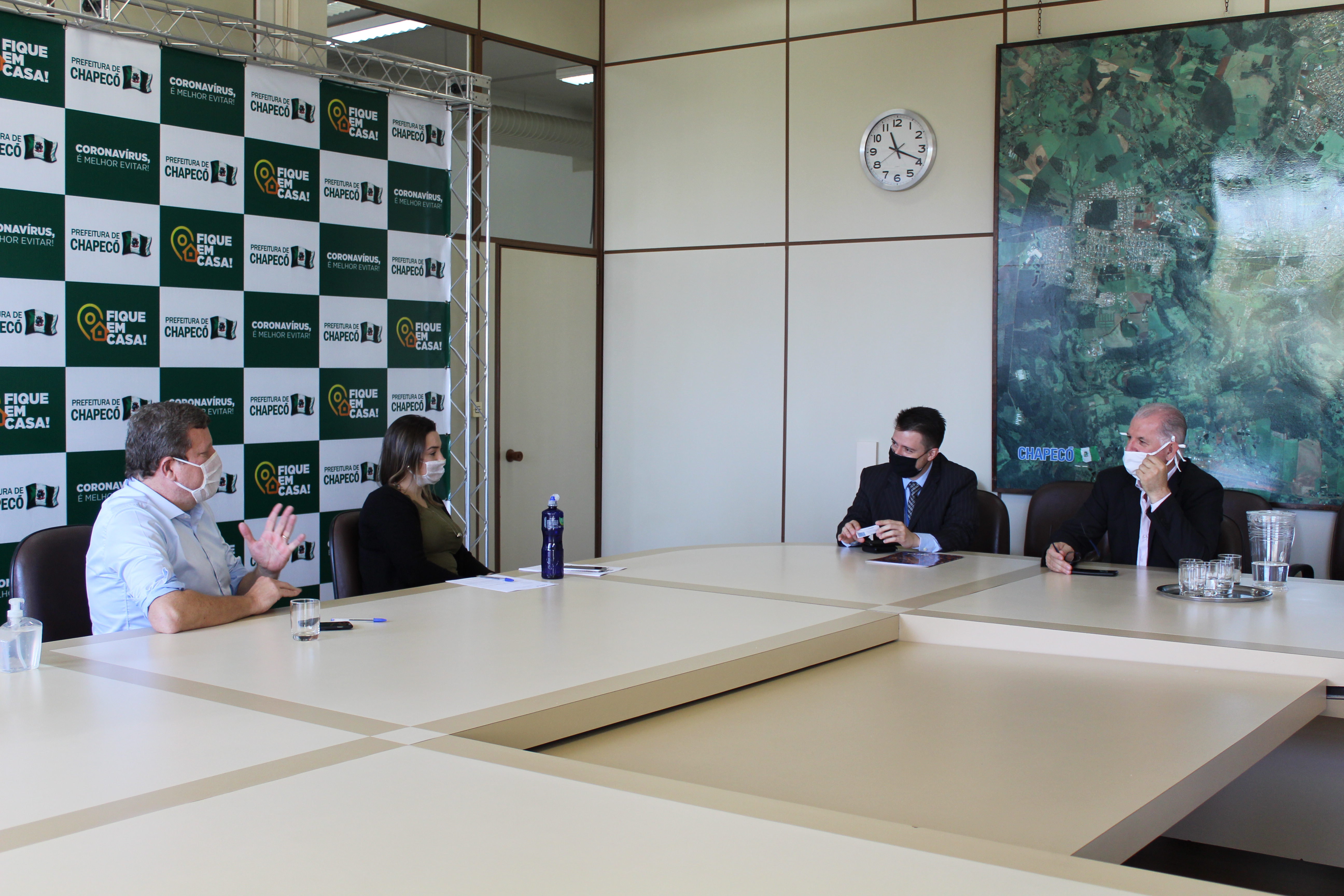 Chapecó, 05/05/2020, terça-feira A Administração Municipal recebeu na última segunda-feira (04) a visita dos representantes da Caixa Econômica Federal de Chapecó. No encontro com o Prefeito Luciano Buligon, a Secretária de Governo e Gestão, Fernanda Danielli, o Gerente Geral de Rede, Elias Lazaris e o Superintendente Executivo de Varejo, Diego Martines Rodrigues, apresentaram um plano de ações para enfrentamento ao Covid-19 que está sendo adotado pelas agências. Algumas práticas estão em andamento e outras contam com o apoio das ações já desenvolvidas pelo Município no sentido de orientar os usuários de Chapecó.