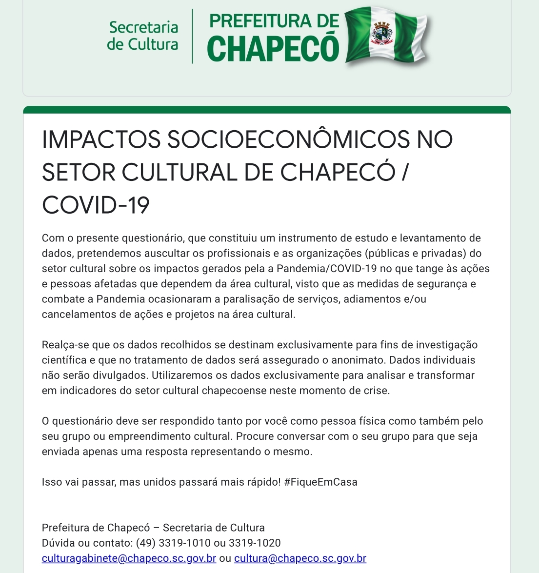 O setor cultural foi diretamente afetado pelas paralisações e medidas de isolamento adotadas em função da Pandemia. Com isso, todas as pessoas envolvidas na criação, produção, divulgação e organização de eventos e produções culturais foram afetadas socioeconomicamente. De acordo com o Secretário de Cultura de Chapecó, Nemésio Carlos da Silva, essa pesquisa foi gerada com o intuito de conhecer e entender quem são as pessoas e qual a abrangência desses impactos.