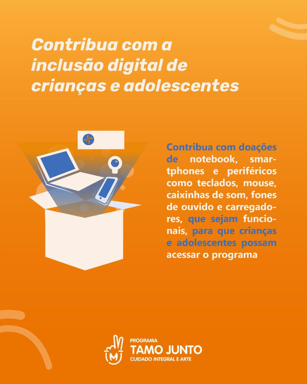 Chapecó, 14/05/2020, quinta-feira Talvez você tenha na sua casa para doar equipamentos eletrônicos em bom funcionamento? Então você pode ajudar o Programa Tamo Junto Cuidado Integral e Arte, que foi criado para garantir atendimentos à infância e adolescência em situação de vulnerabilidade social durante a pandemia da Covid-19, oferecendo acolhimento e cuidado em saúde, assistência social e cultural de forma on-line.