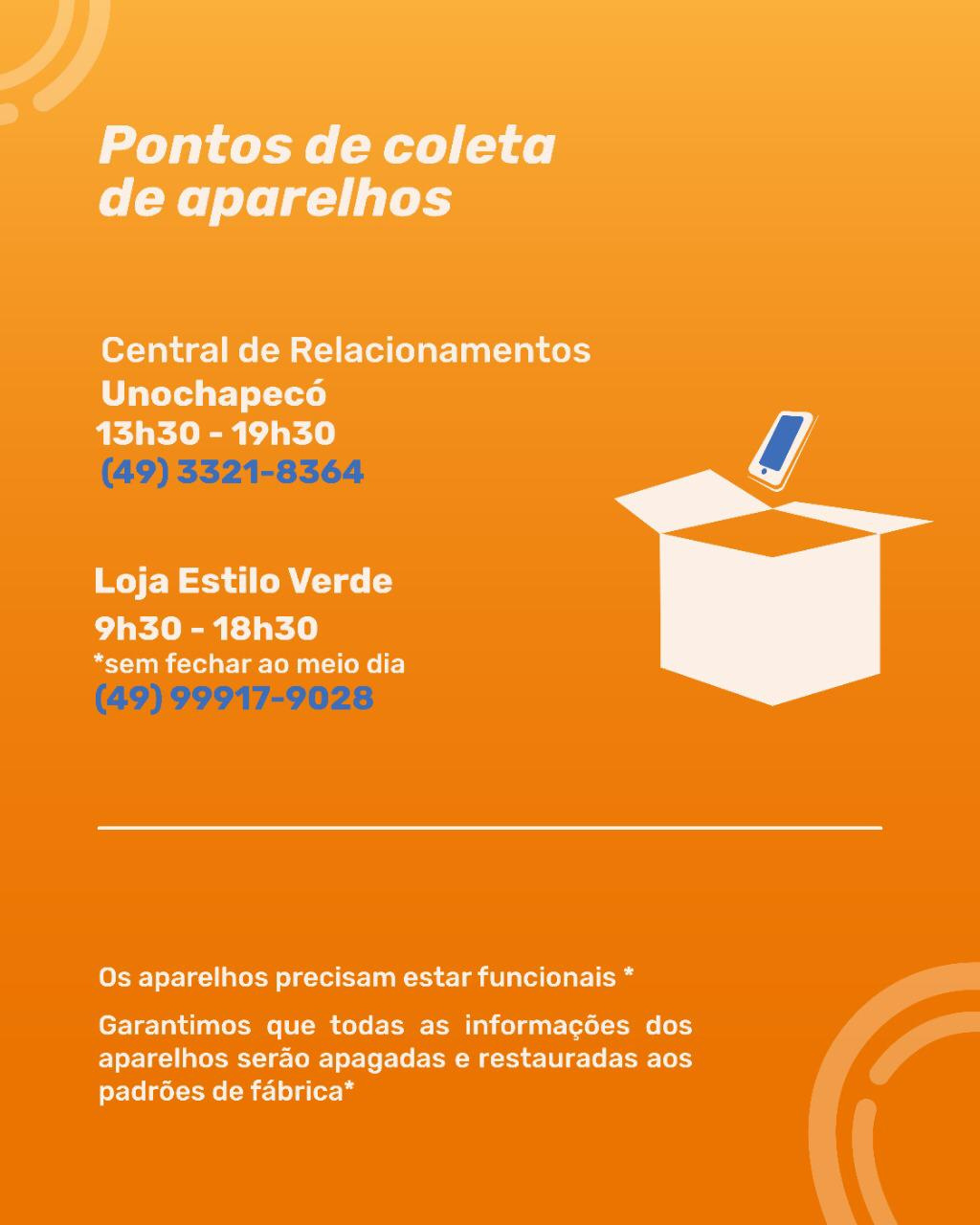 Para que as crianças e adolescentes selecionadas para participar do programa tenham acesso as aulas, elas precisam de notebooks, smartphones e equipamentos como teclados, mouse, caixas de som, fones de ouvidos e carregadores que estejam em funcionamento. Qualquer pessoa pode doar em dois locais: na Loja Estilo Verde, das 09h30 às 18h30, ou na Unochapecó, das 13h30 às 19h30. Mais informações pelos telefones (49) 9 9917-9028 ou (49) 3321-8364.