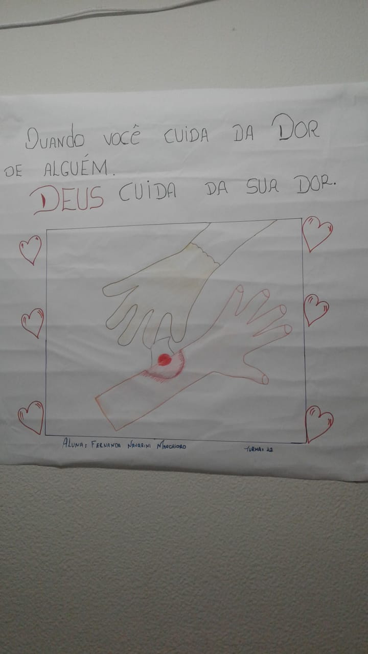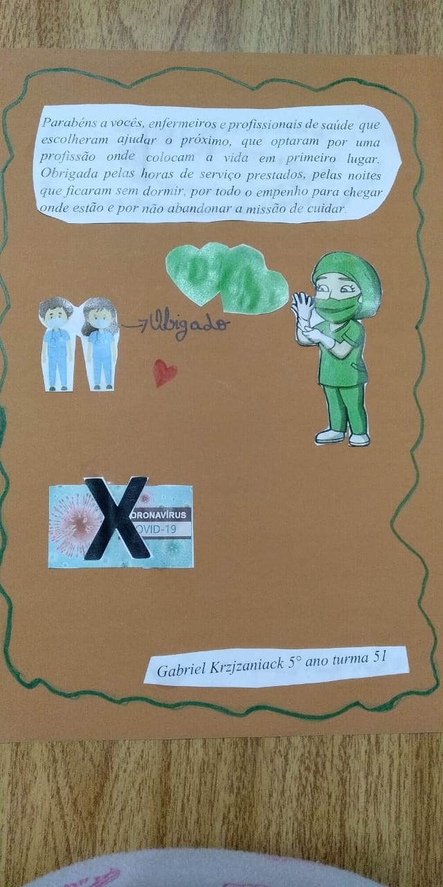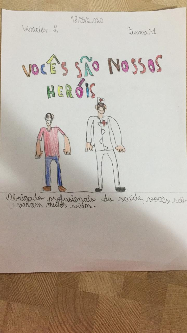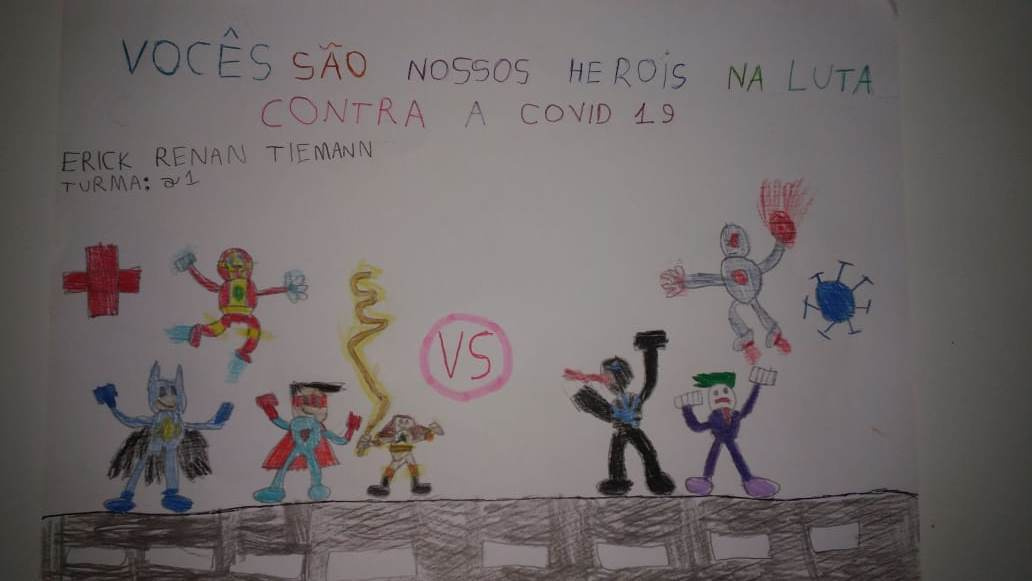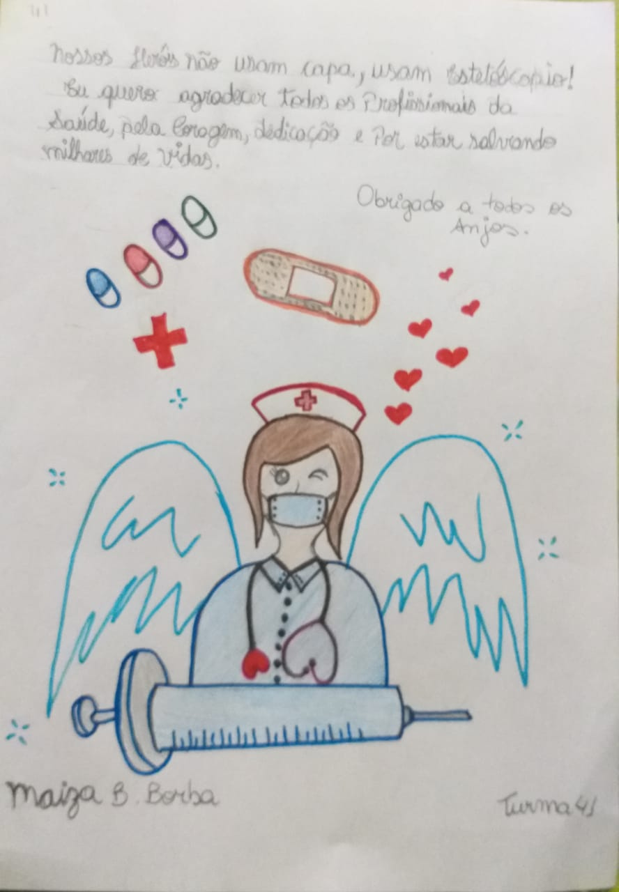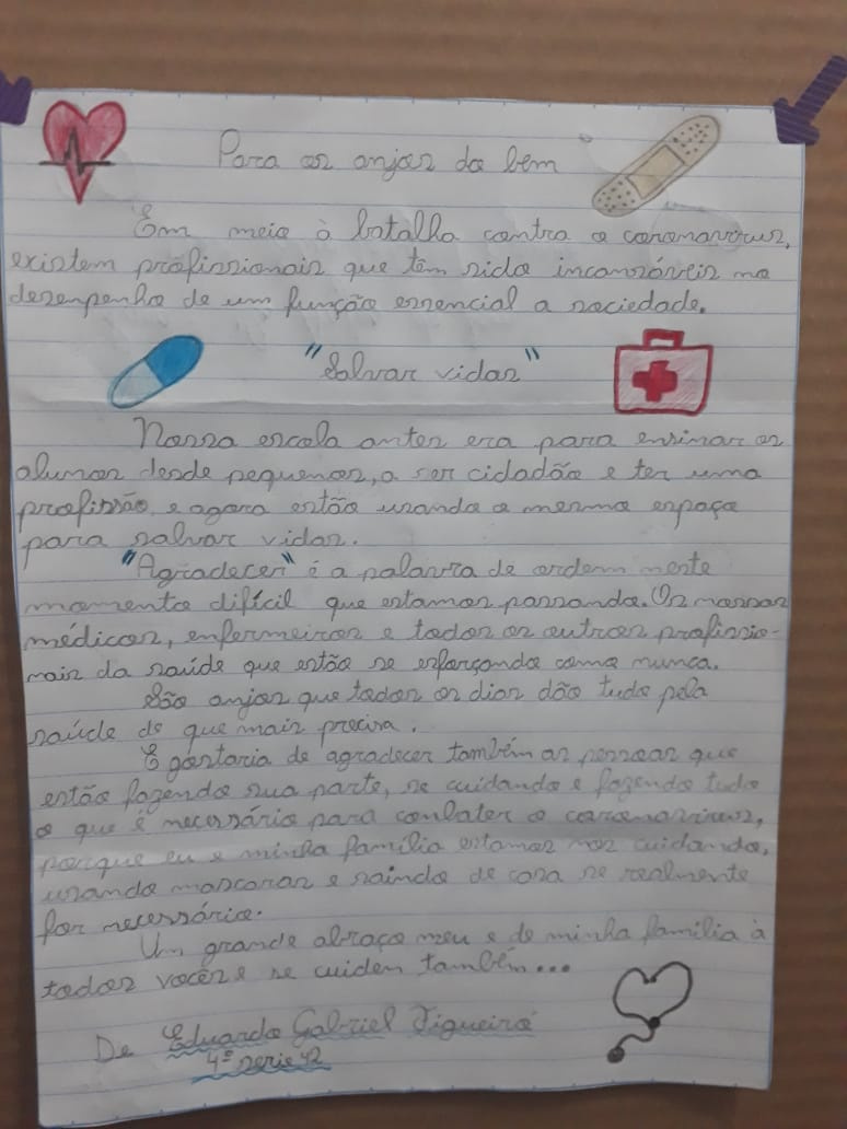 Os alunos preparam materiais, vídeos, desenhos e mensagens que foram repassados aos profissionais por whatsapp e também foram expostos no hall de entrada da Escola.
